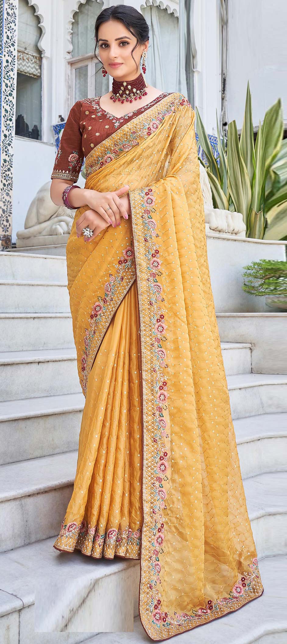Yellow color Saree in Bangalore Silk, Silk fabric with Embroidered, Resham, Sequence, Thread work