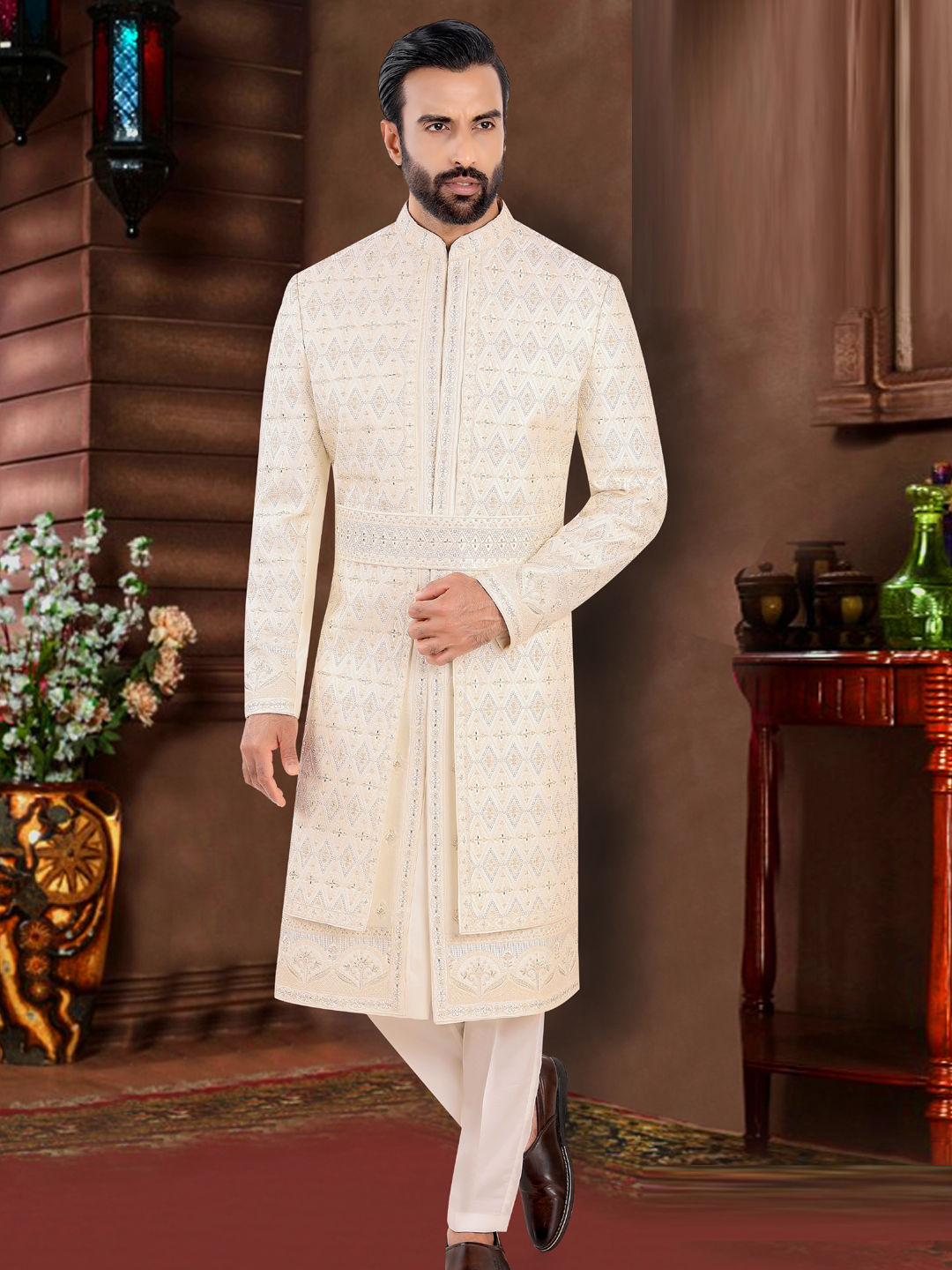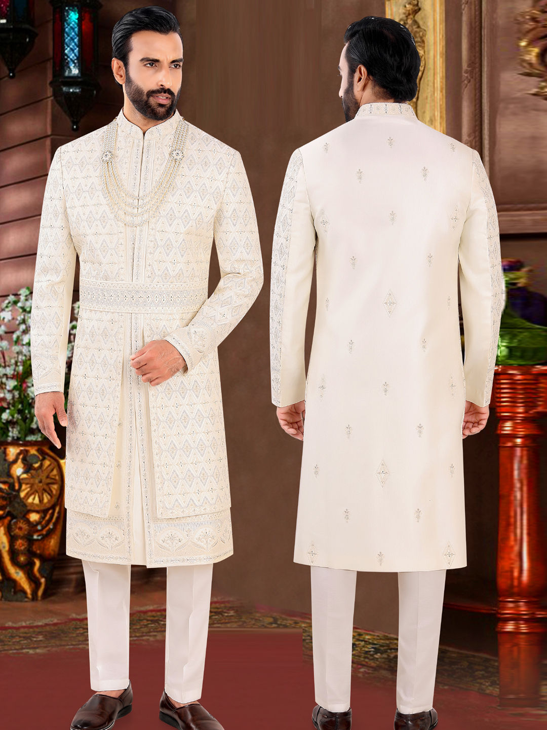 Jacquard Wedding Sherwani in White and Off White with Thread work