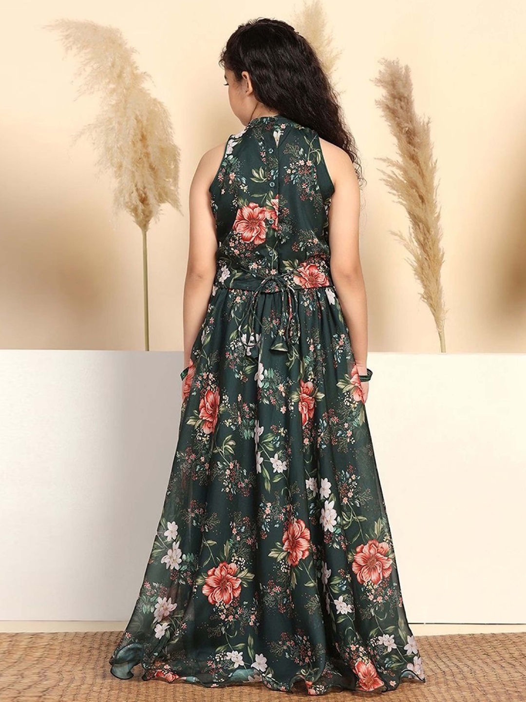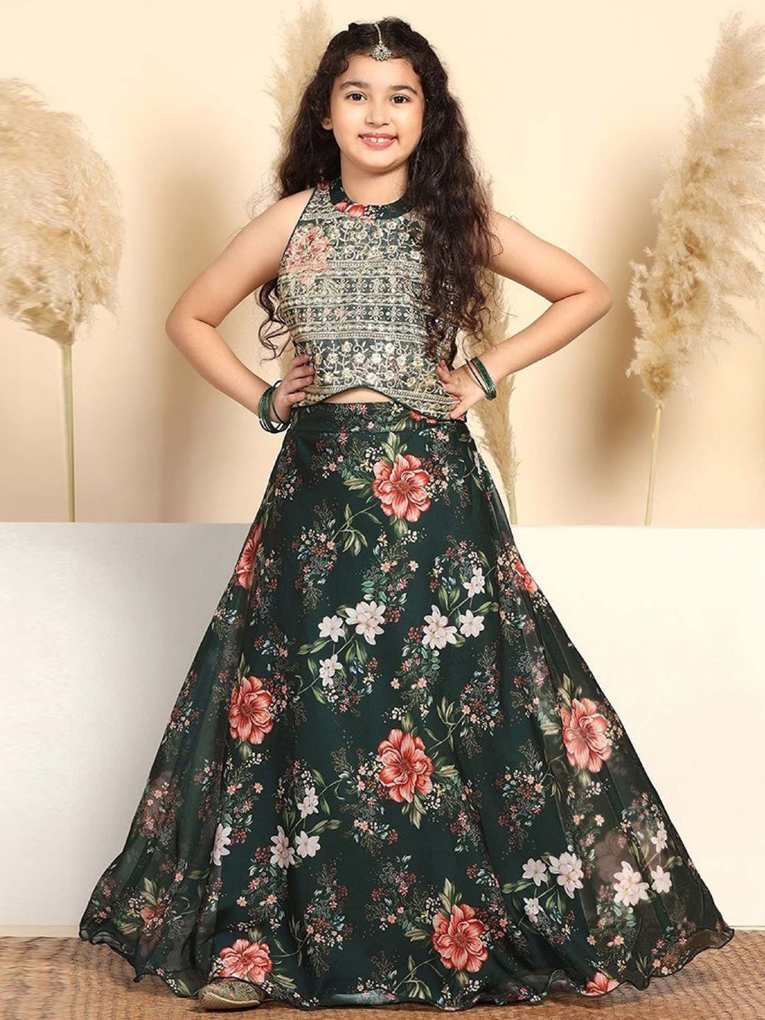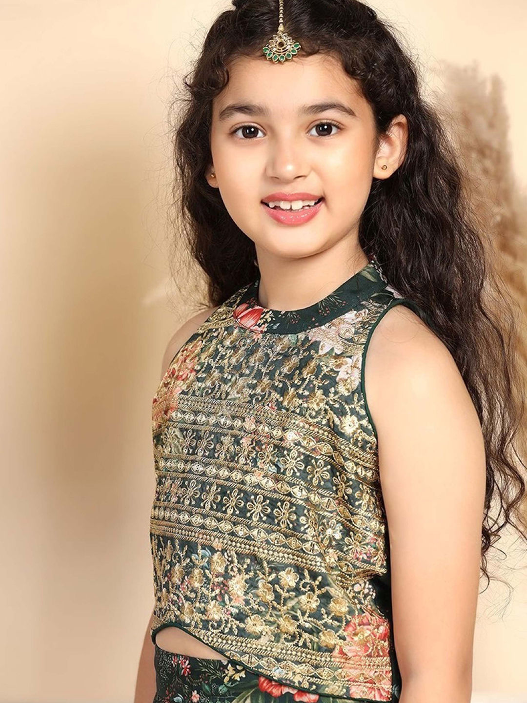 Green color Kids Lehenga in Silk fabric with Embroidered, Floral, Lace, Printed, Sequence work