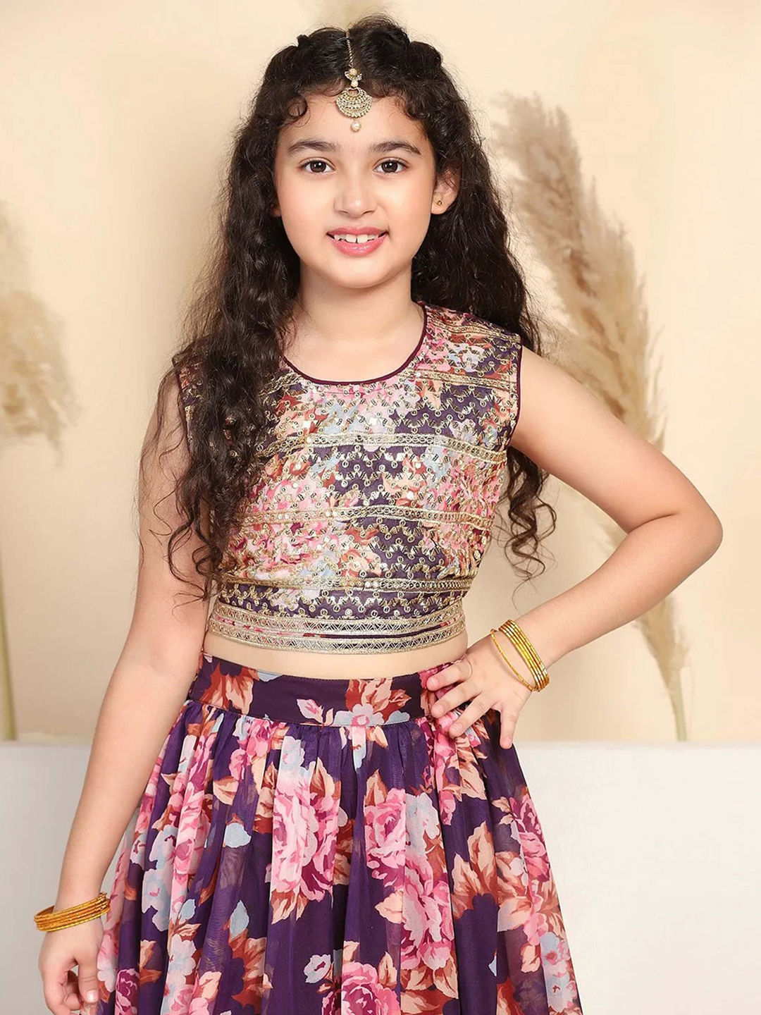 Purple and Violet color Kids Lehenga in Silk fabric with Embroidered, Floral, Lace, Printed, Sequence work