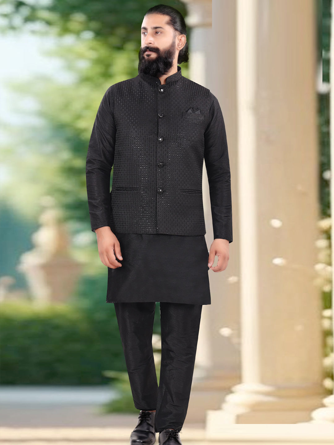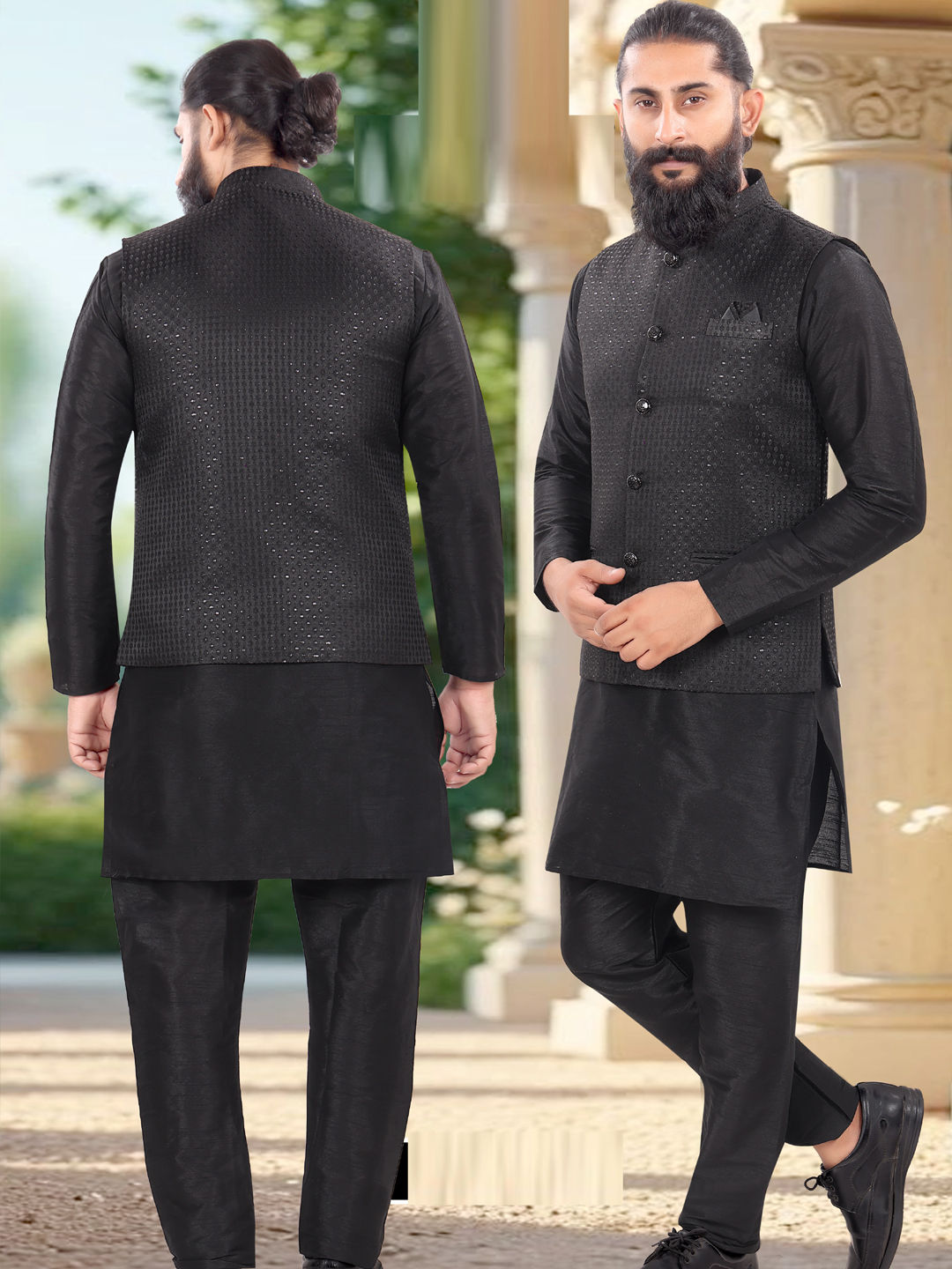 Silk Festive Kurta Pyjama with Jacket in Black and Grey with Weaving work