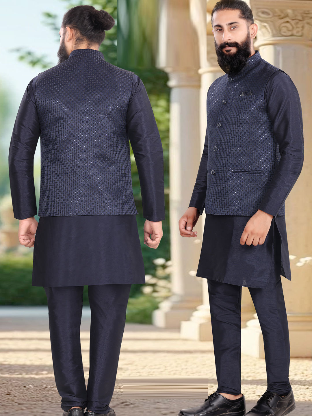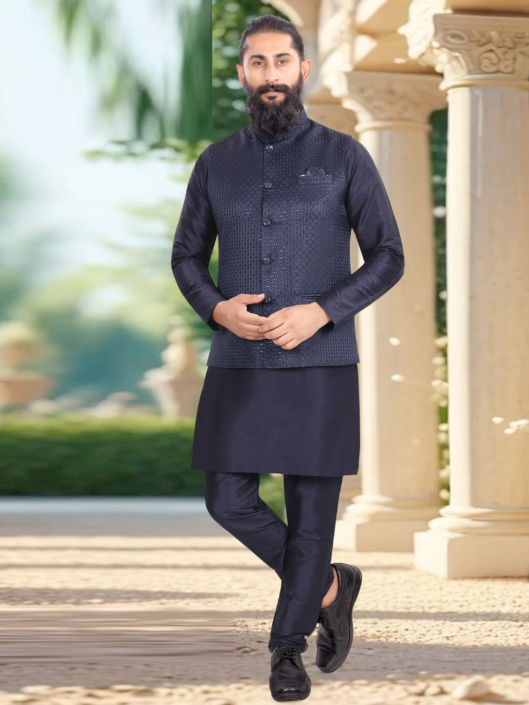 Silk Festive Kurta Pyjama with Jacket in Blue with Weaving work