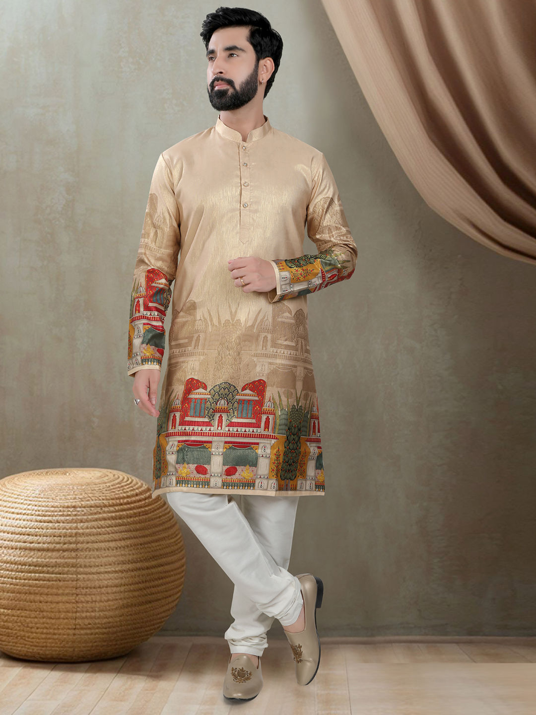 Gold color Kurta Pyjamas in Silk fabric with Printed work