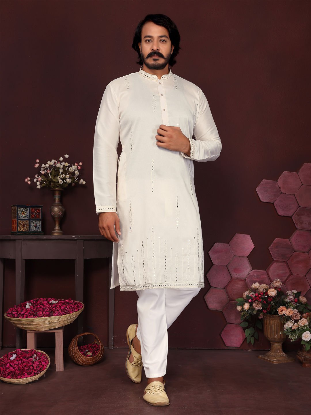 White and Off White color Kurta Pyjamas in Silk fabric with Embroidered, Mirror work