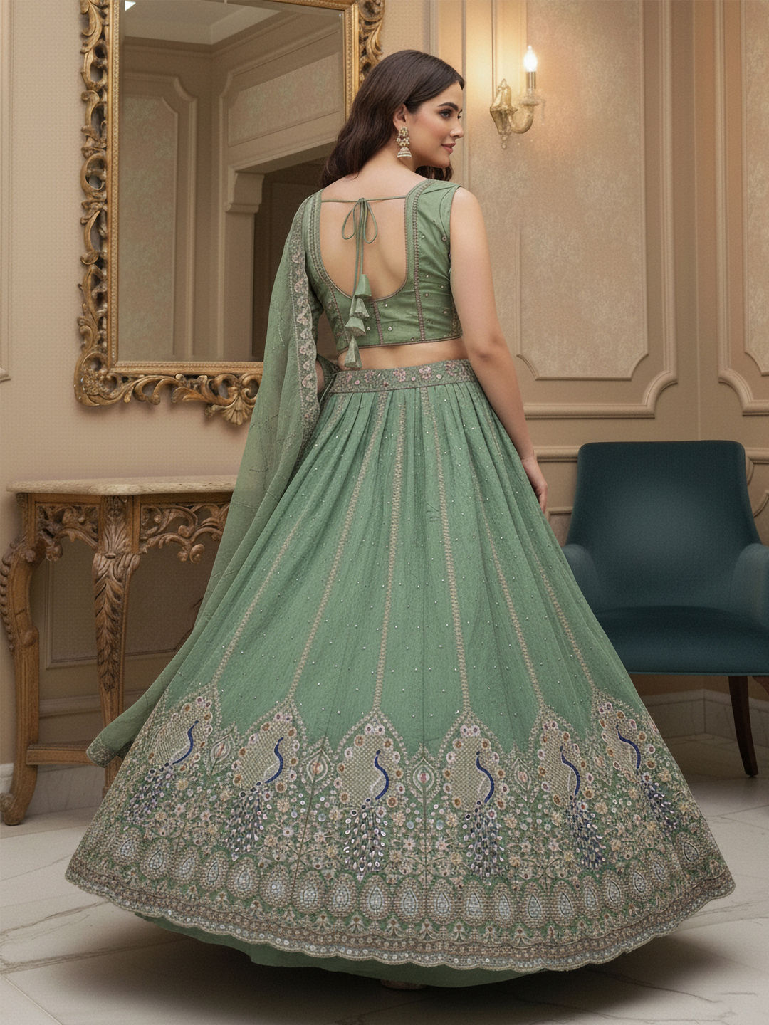 Green color Lehenga in Silk fabric with Embroidered, Sequence work