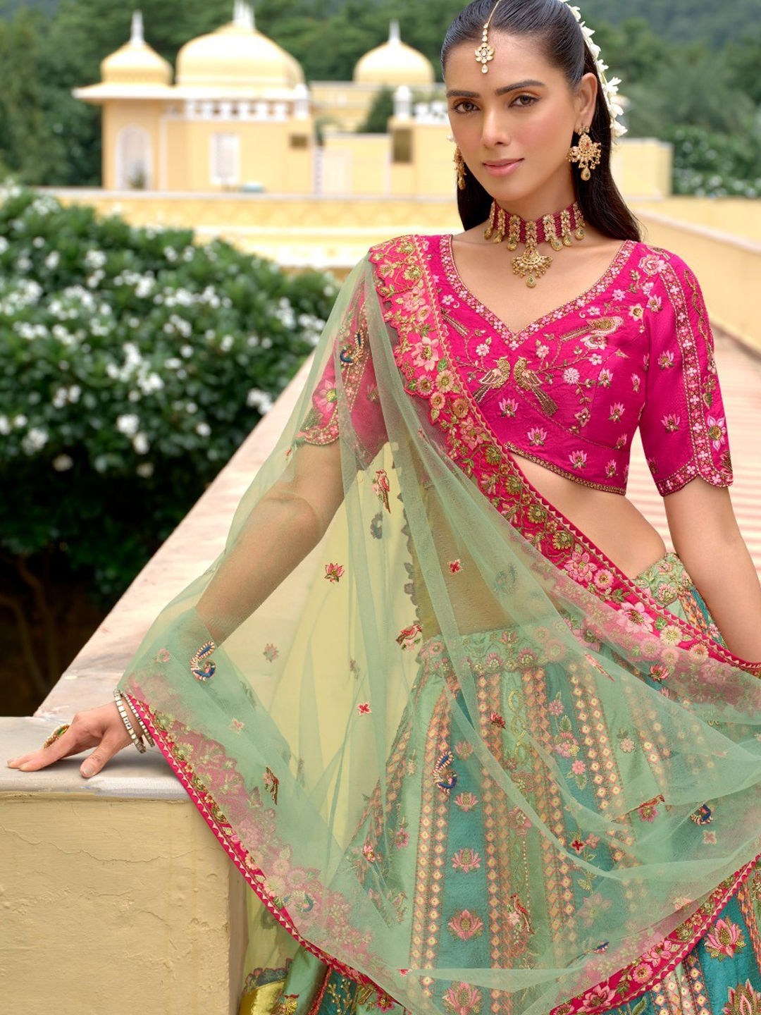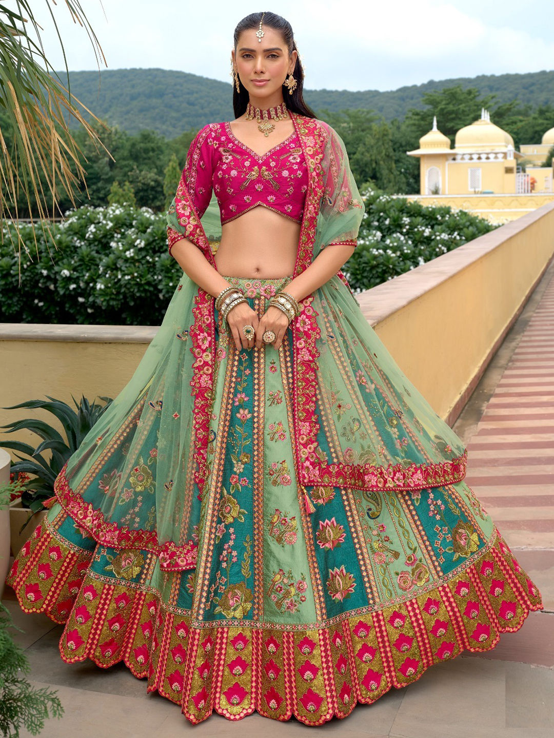 Blue, Green color Lehenga in Silk fabric with Border, Embroidered, Mirror, Sequence, Stone work