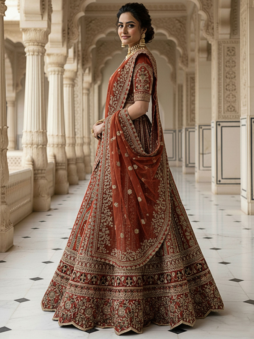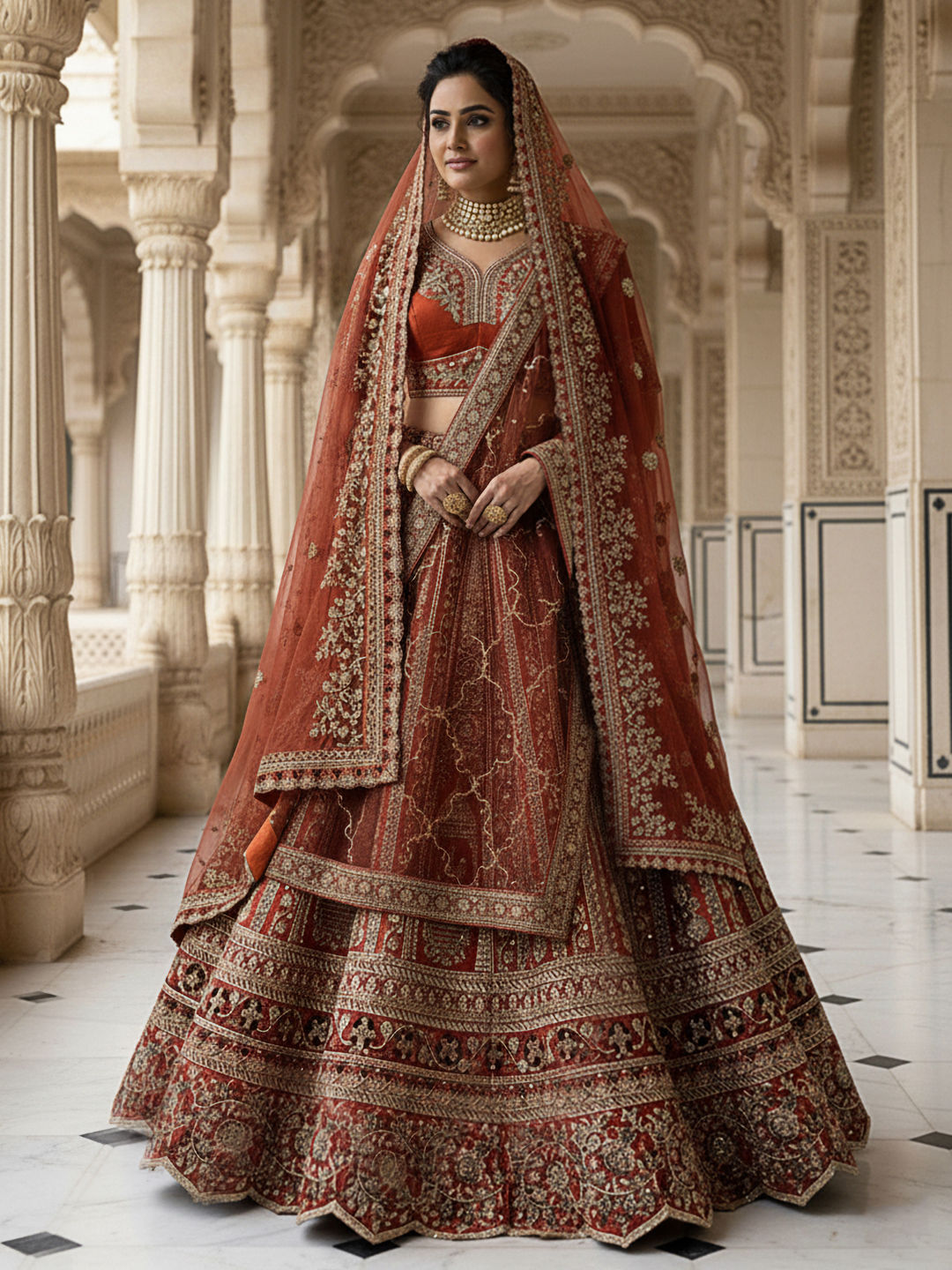 Silk Wedding Lehenga in Red and Maroon with Thread work