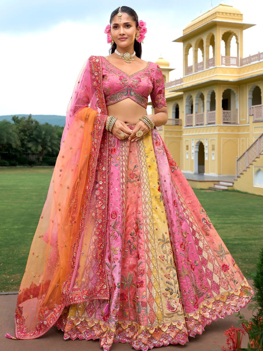 Silk Bridal Lehenga in Multicolor with Embroidered work