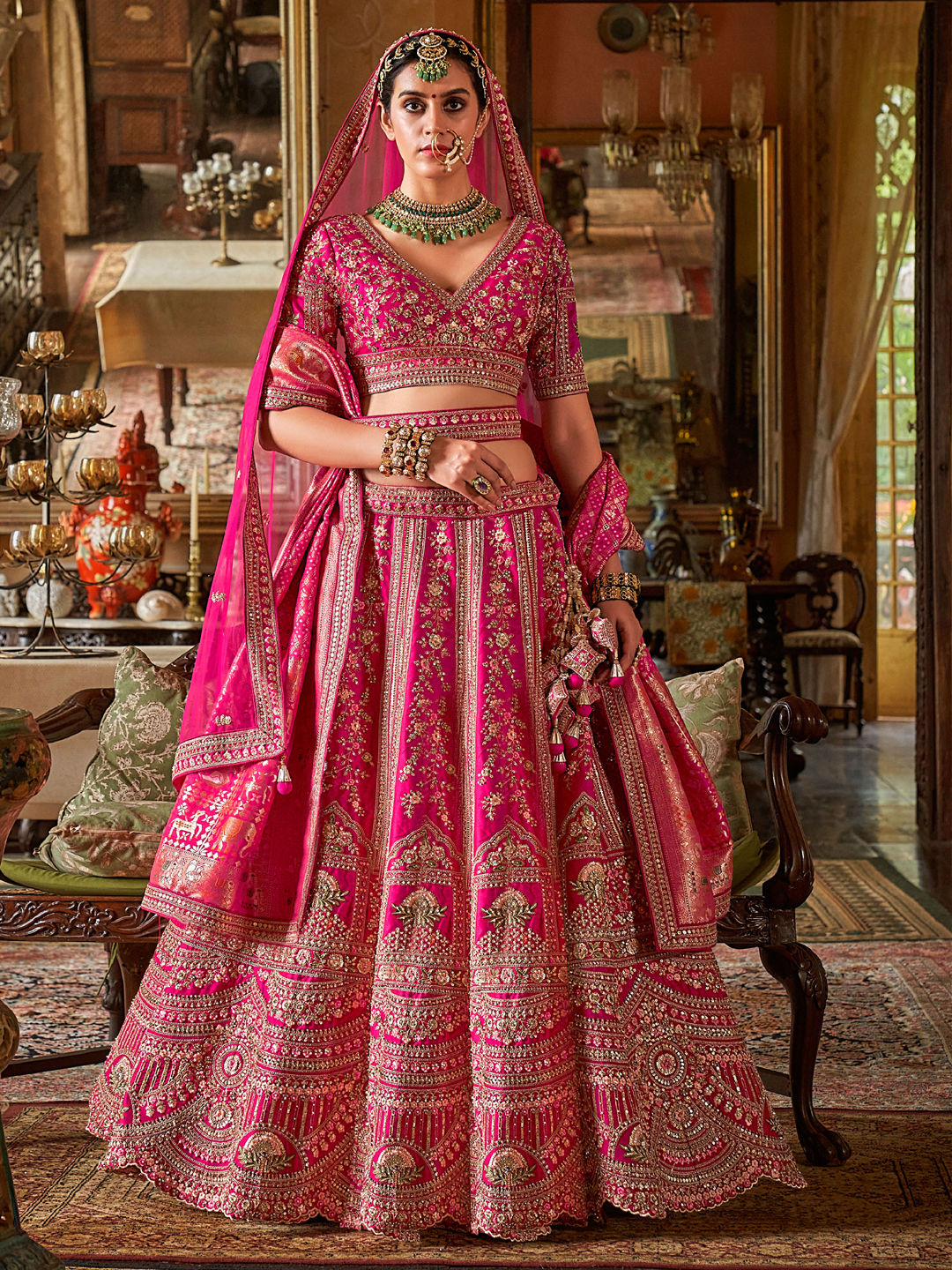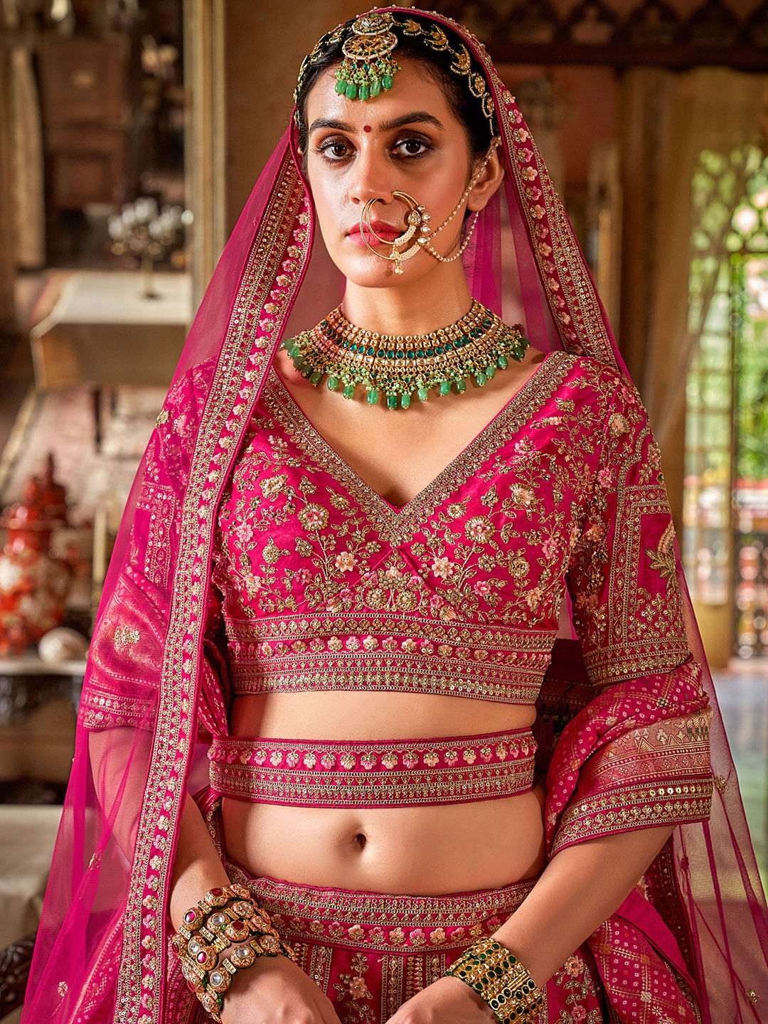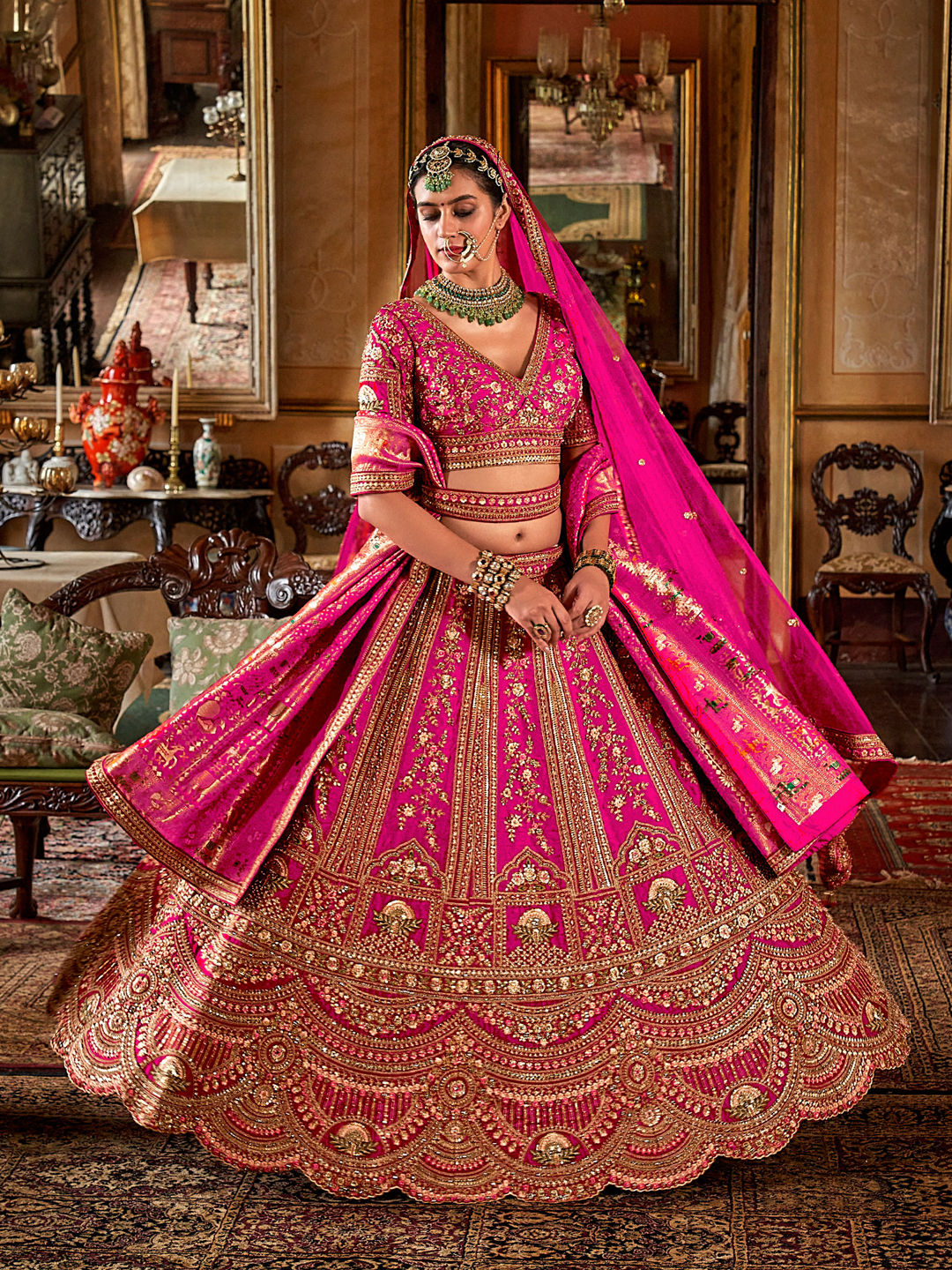 Pink and Majenta color Lehenga in Silk fabric with Border, Embroidered, Sequence, Stone, Thread, Weaving, Zari work