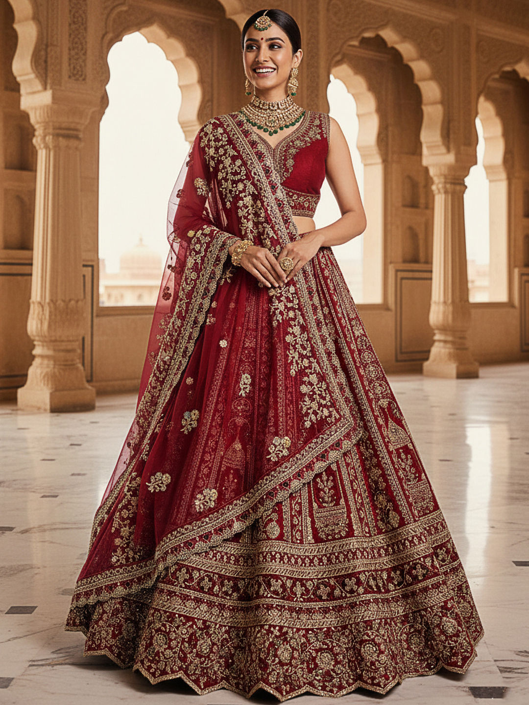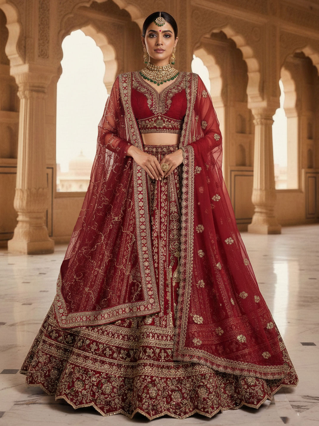 Red and Maroon color Lehenga in Silk fabric with Embroidered, Sequence, Stone, Thread, Zari work