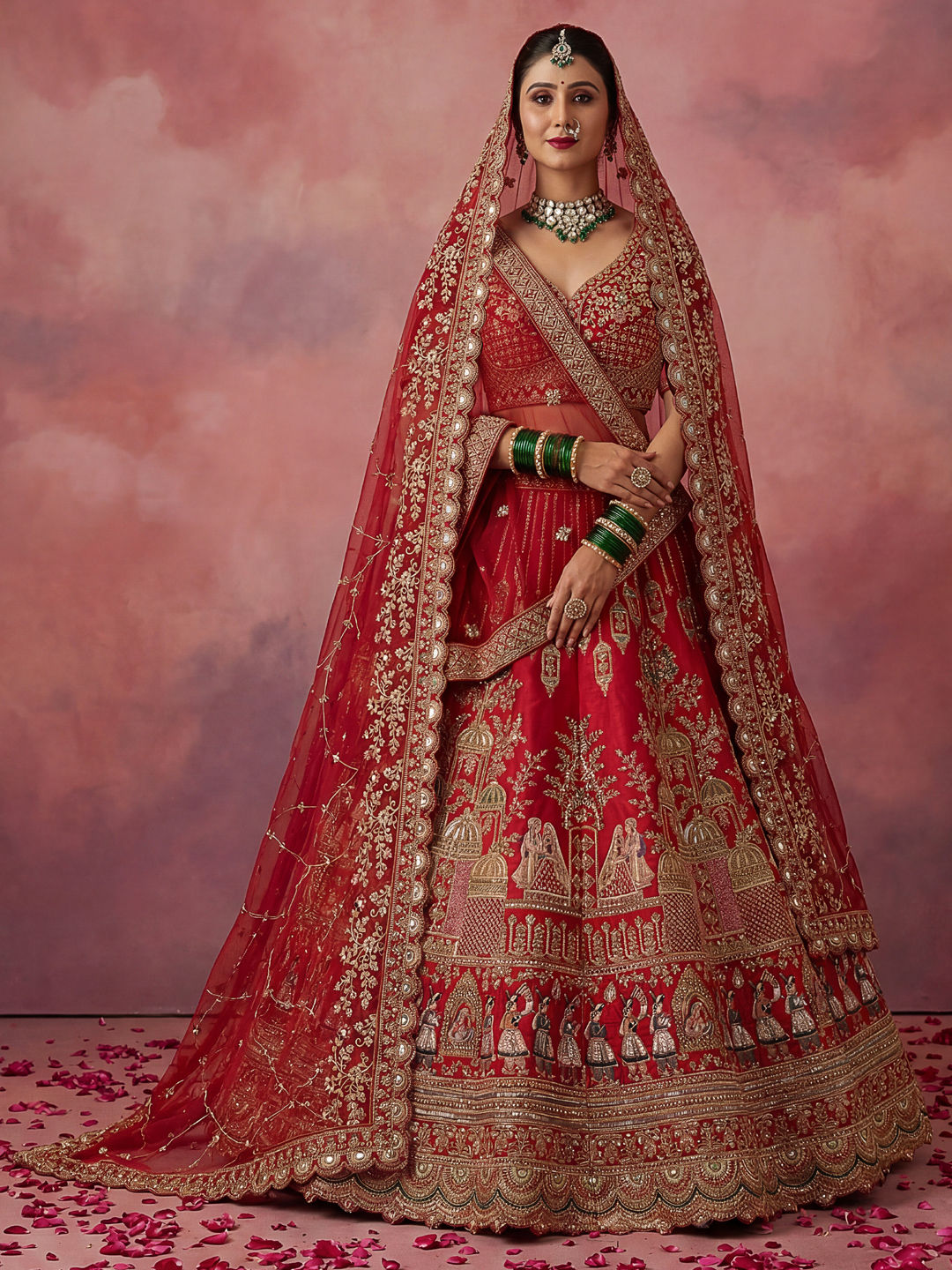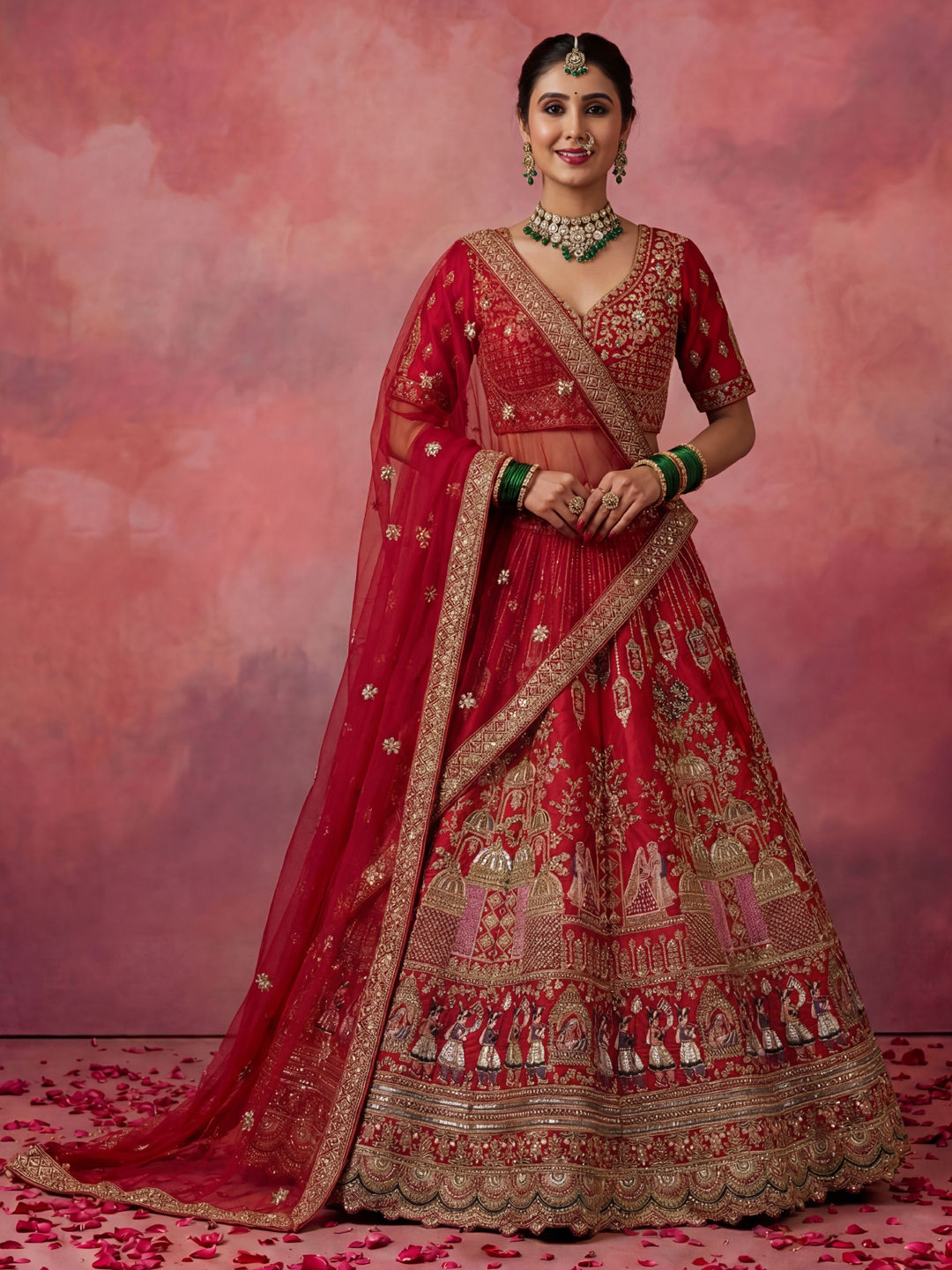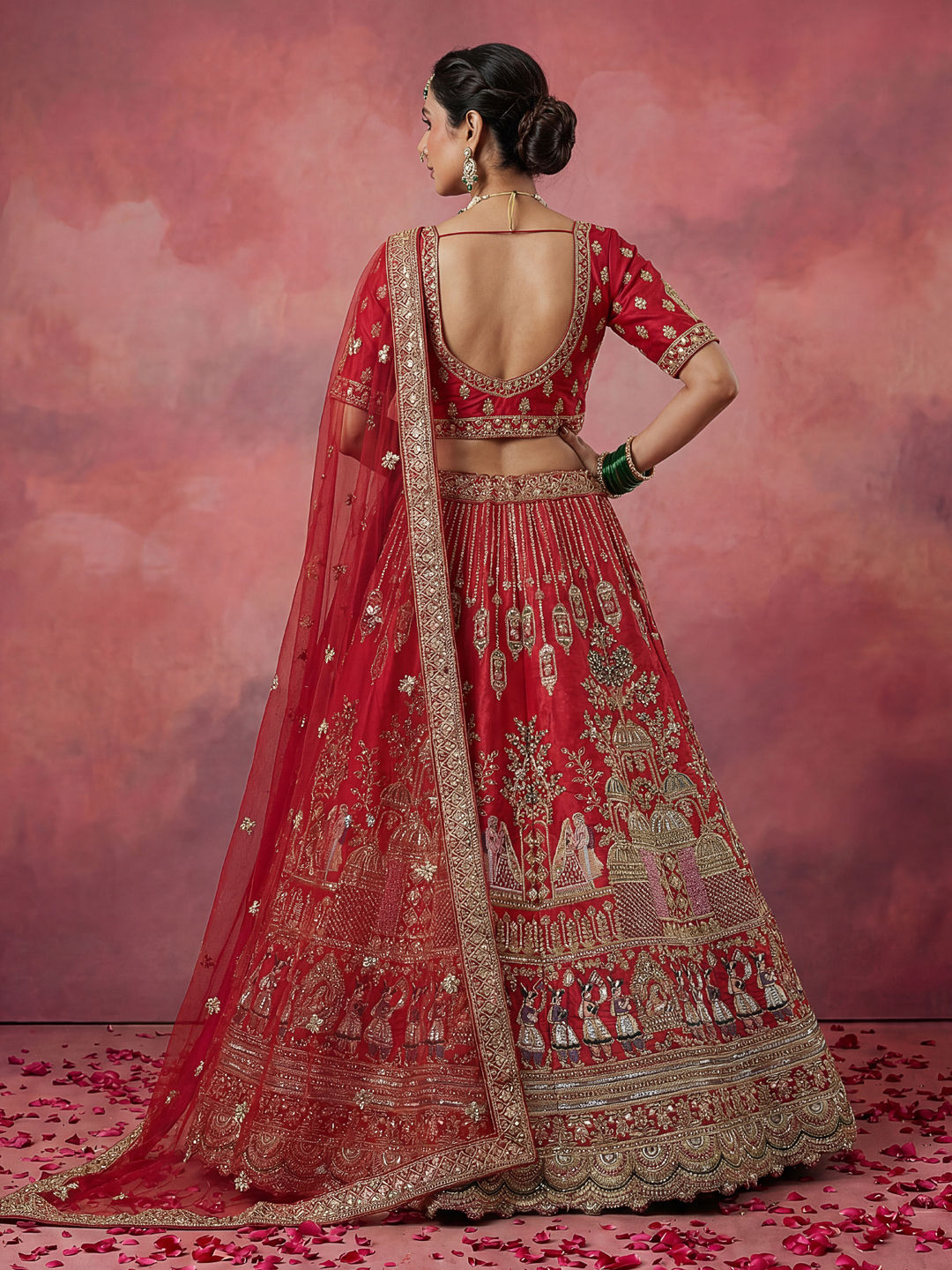 Red and Maroon color Lehenga in Silk fabric with Embroidered, Sequence, Stone, Thread, Zari work