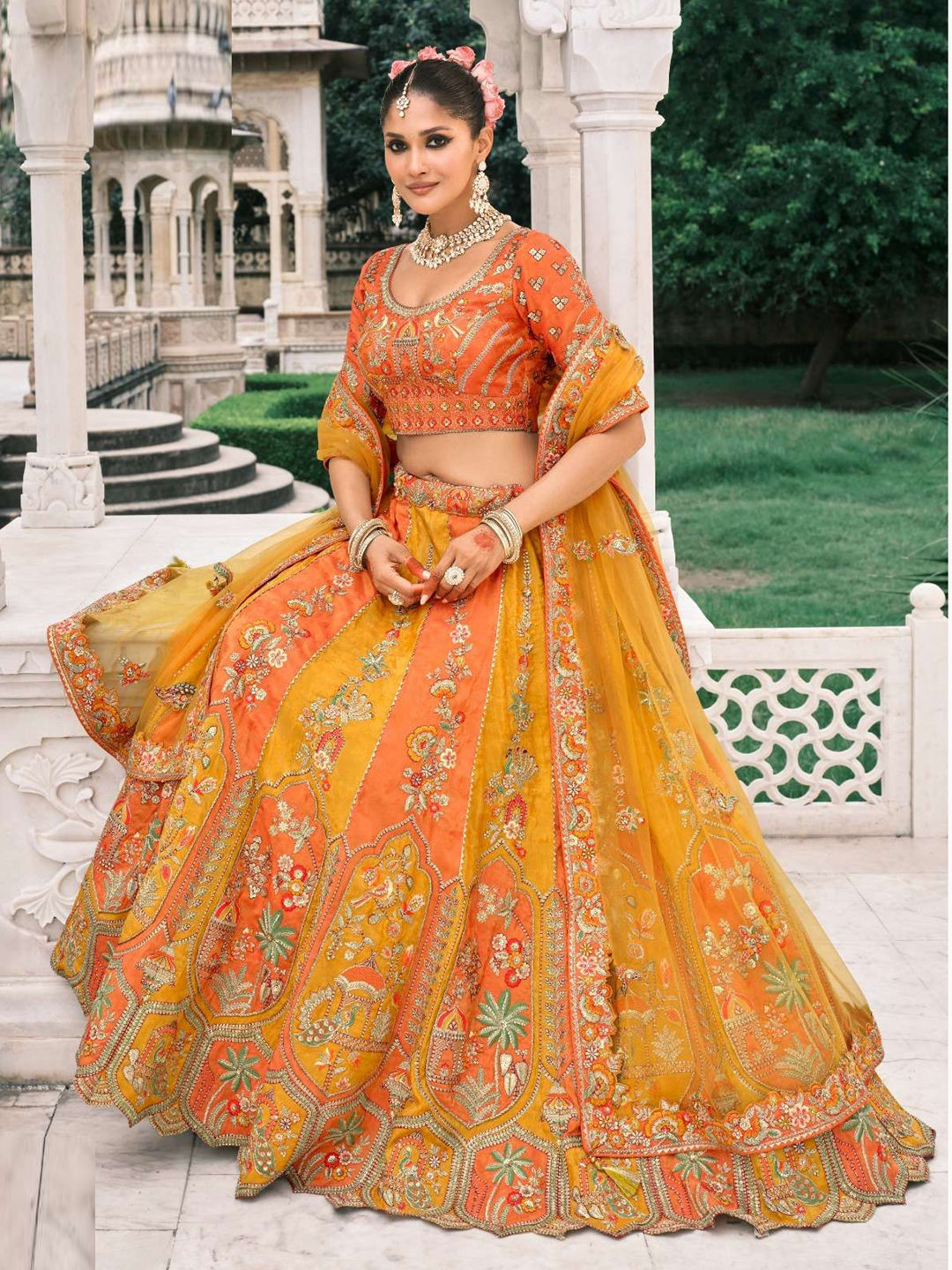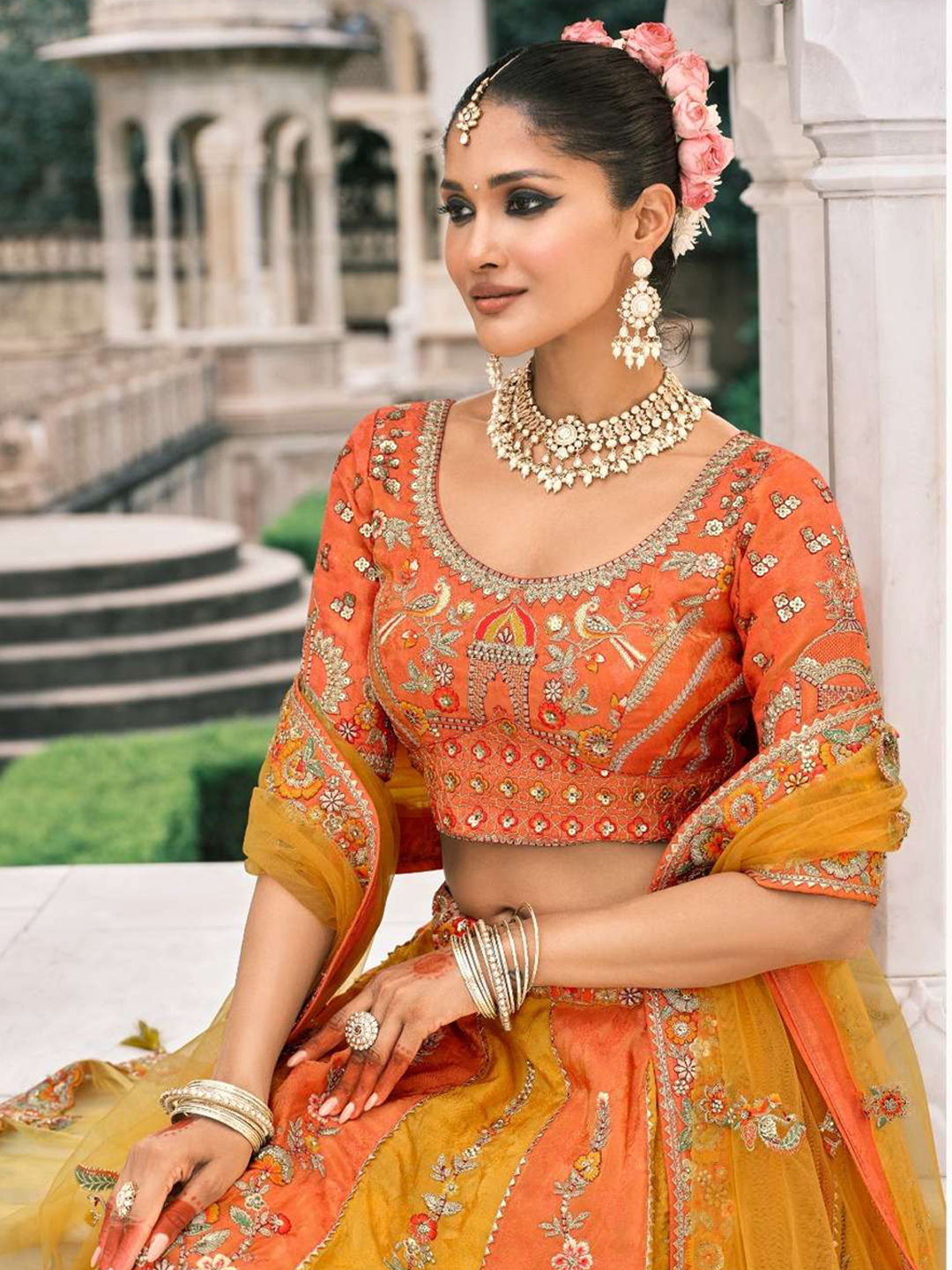 Orange, Yellow color Lehenga in Silk fabric with Embroidered, Sequence, Thread work