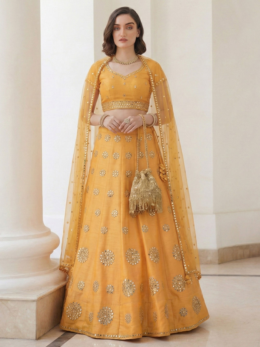 Yellow color Lehenga in Silk fabric with Mirror, Thread, Zari work