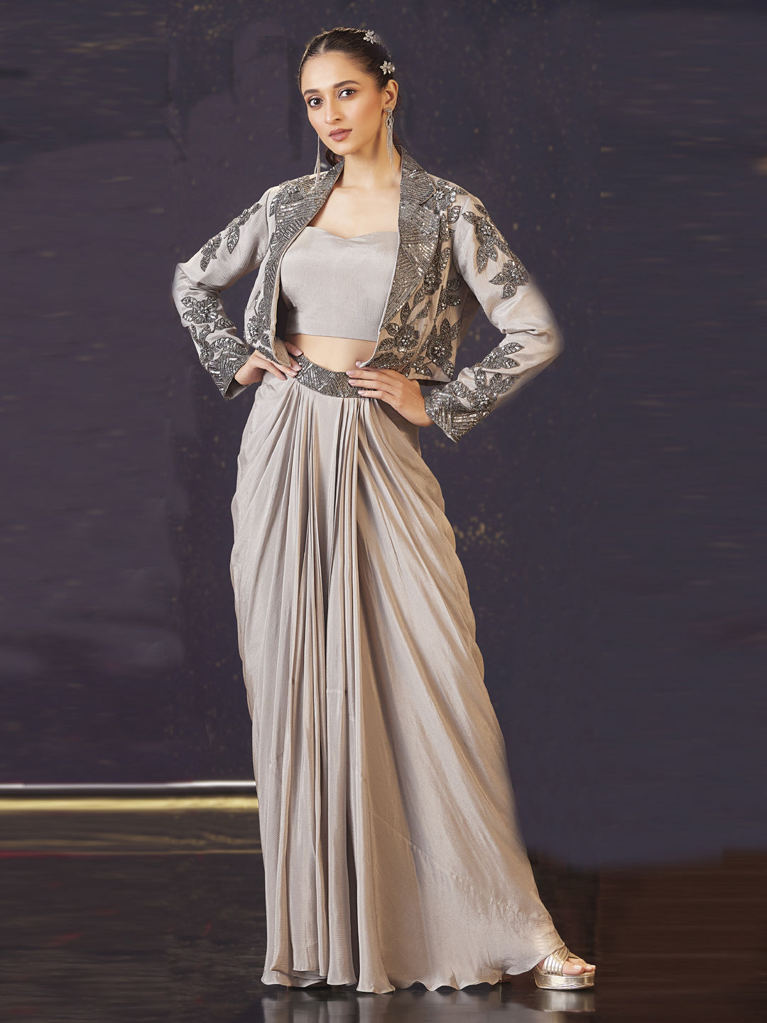 Georgette Engagement Salwar Kameez in Black and Grey with Bugle Beads work