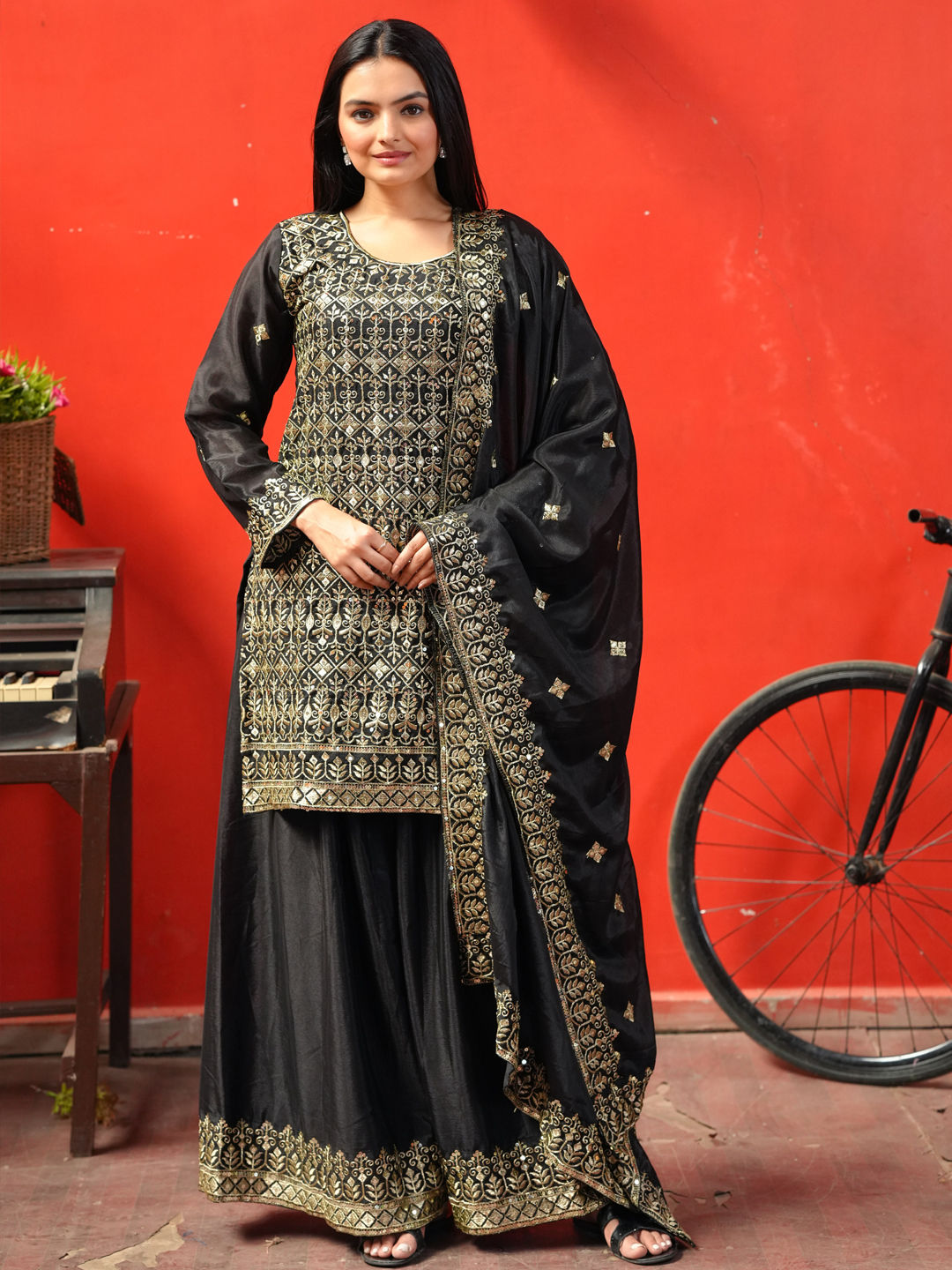 Black and Grey color Salwar Kameez in Silk fabric with Embroidered, Sequence, Thread work