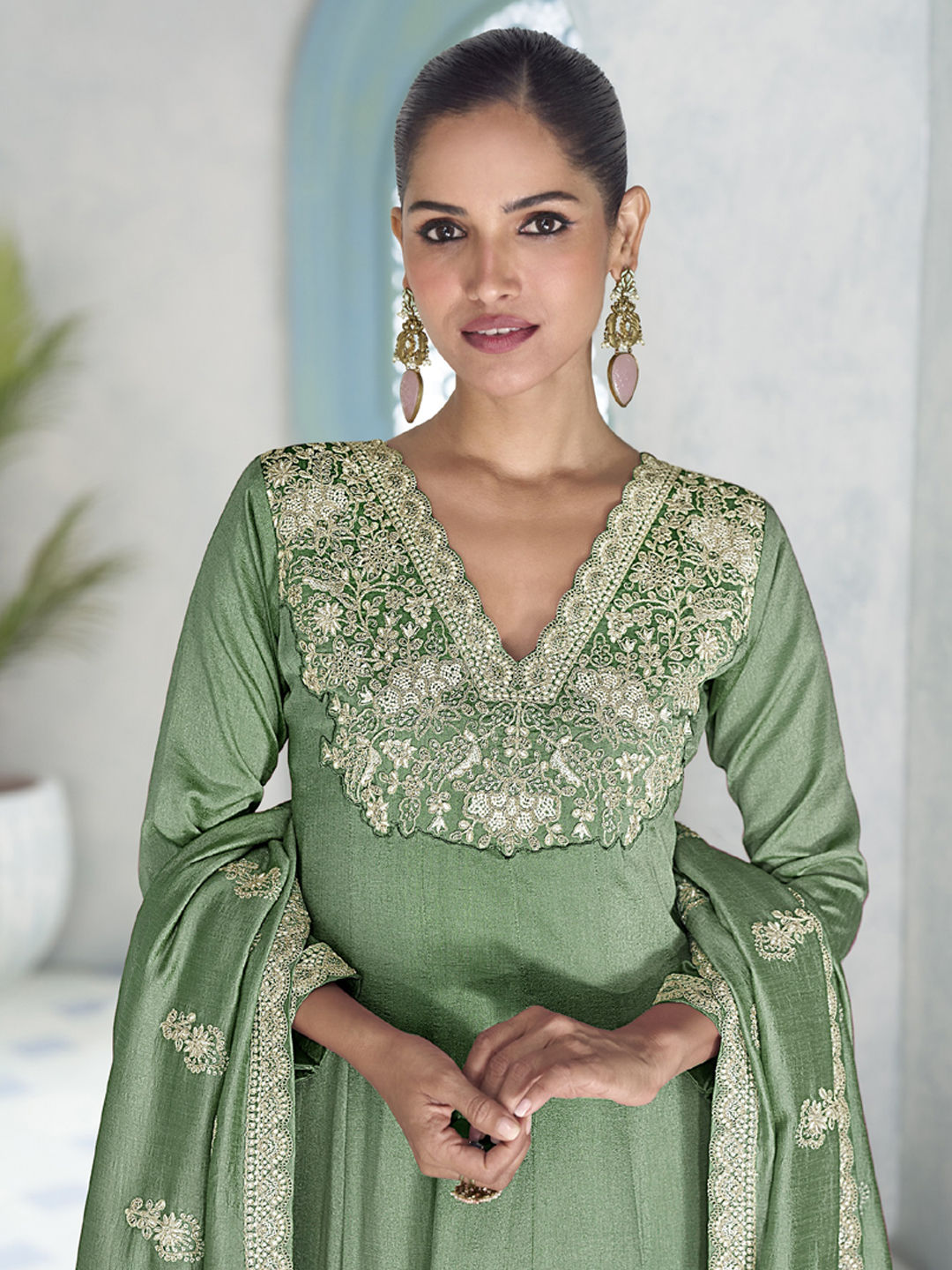 Green color Salwar Kameez in Silk fabric with Embroidered, Sequence work