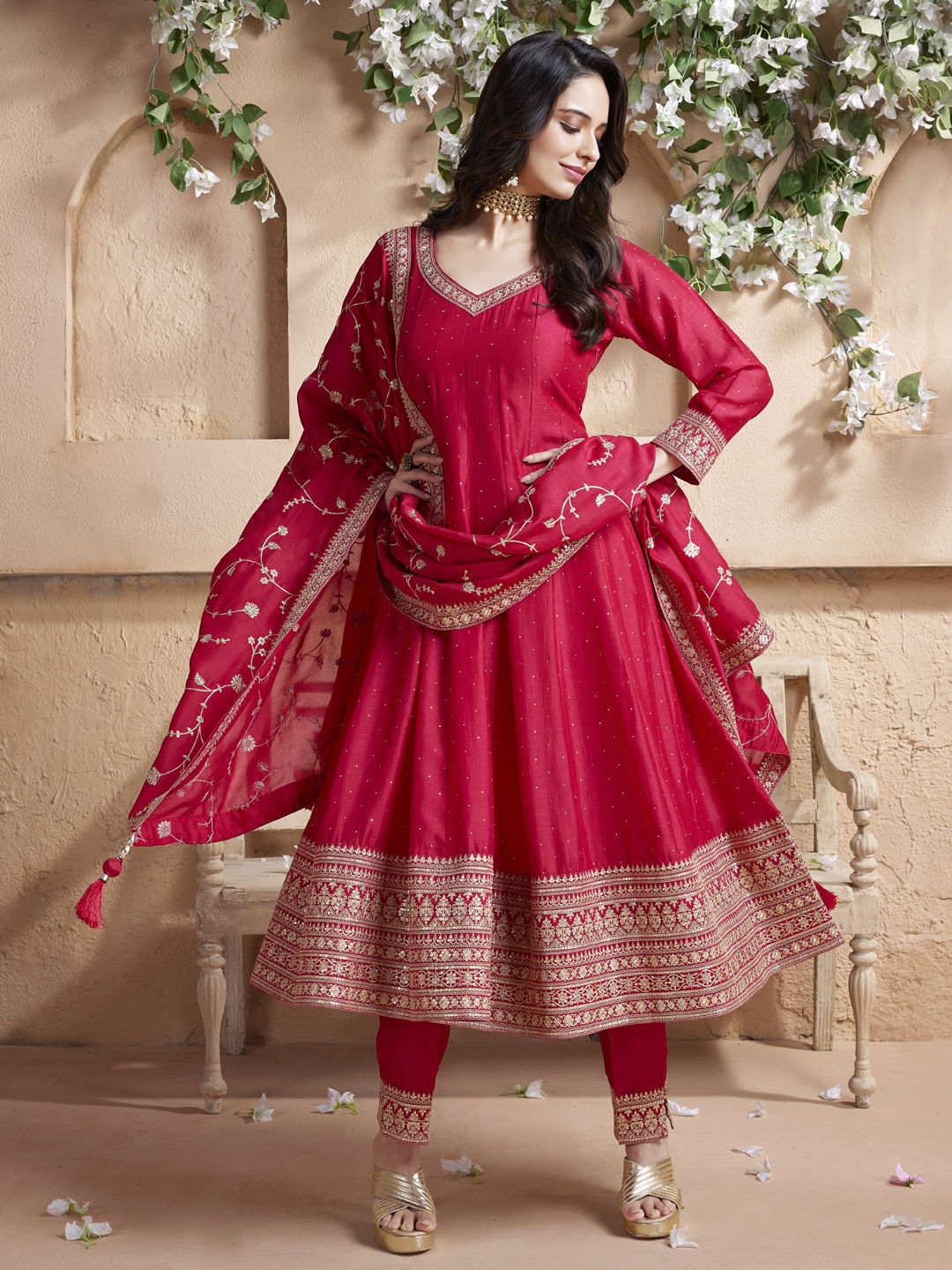 Silk Festive Salwar Kameez in Red and Maroon with Embroidered work