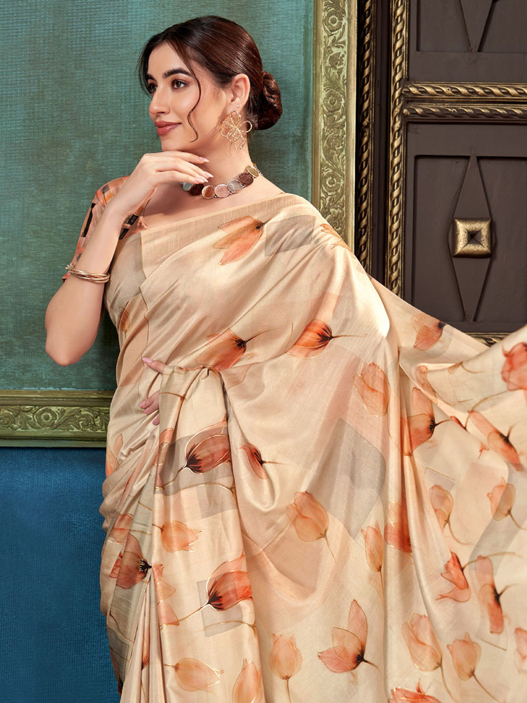 Beige and Brown color Saree in Silk fabric with Floral, Printed work