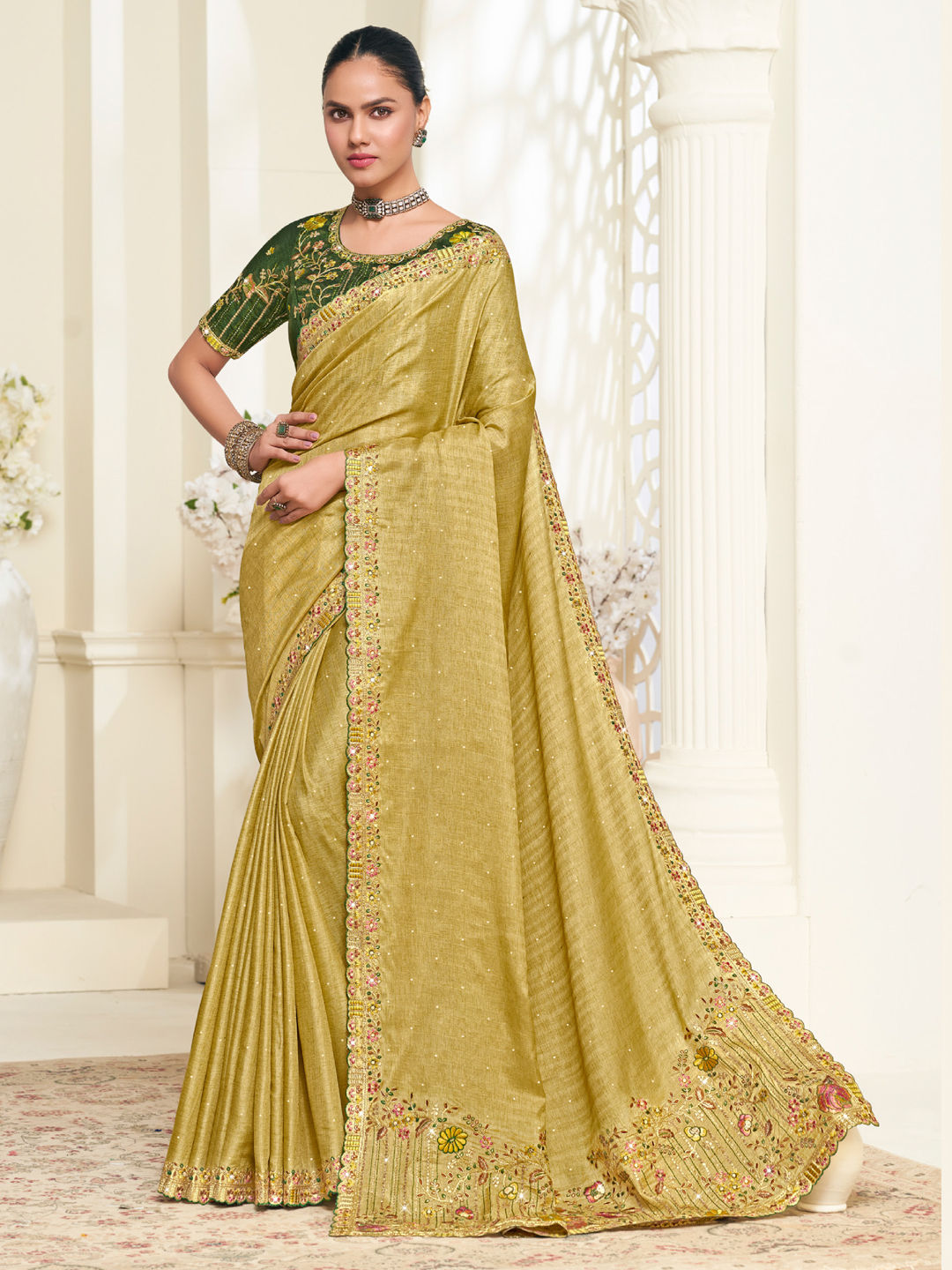 Silk Festive Saree in Green with Embroidered work