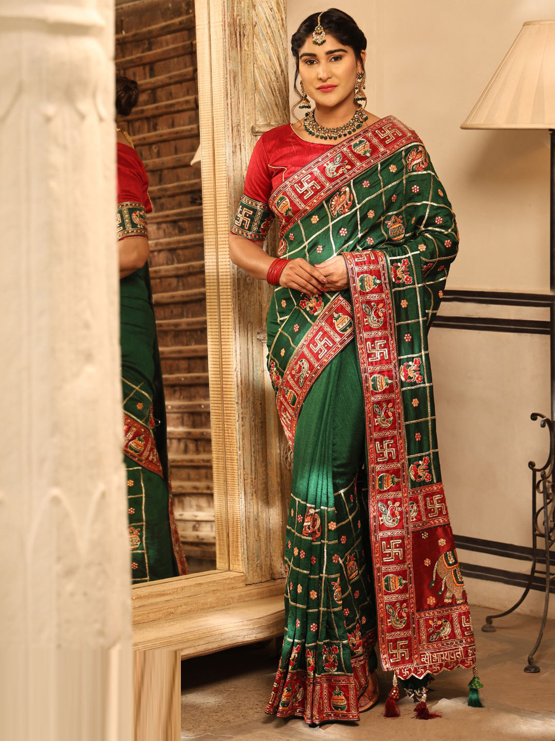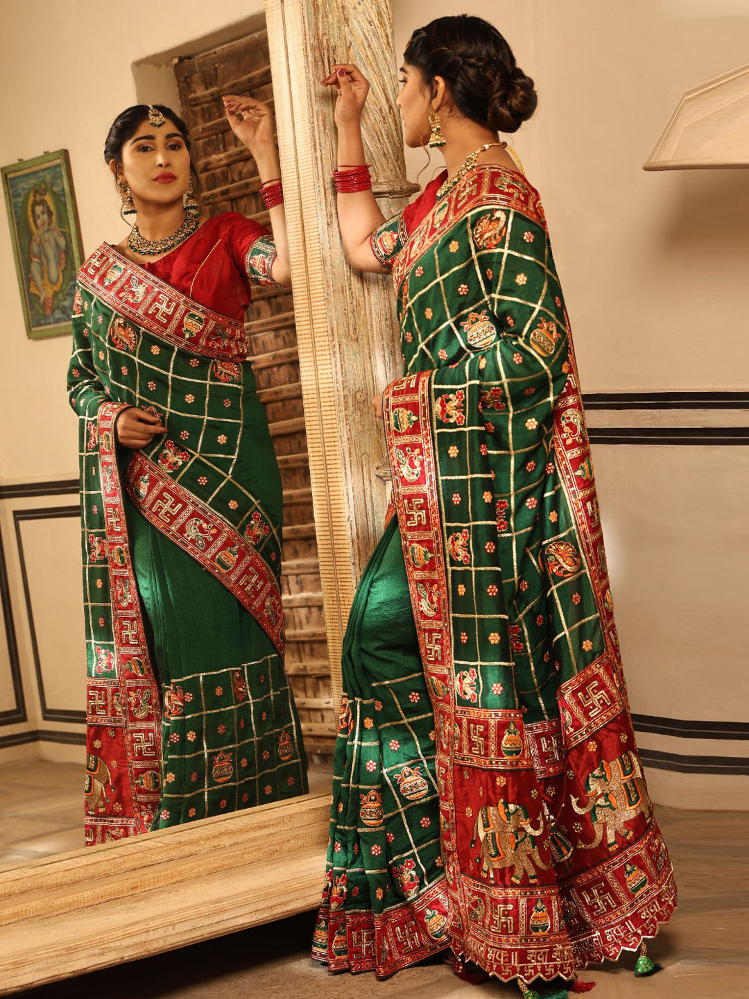 Green color Saree in Silk fabric with Embroidered, Stone, Thread work