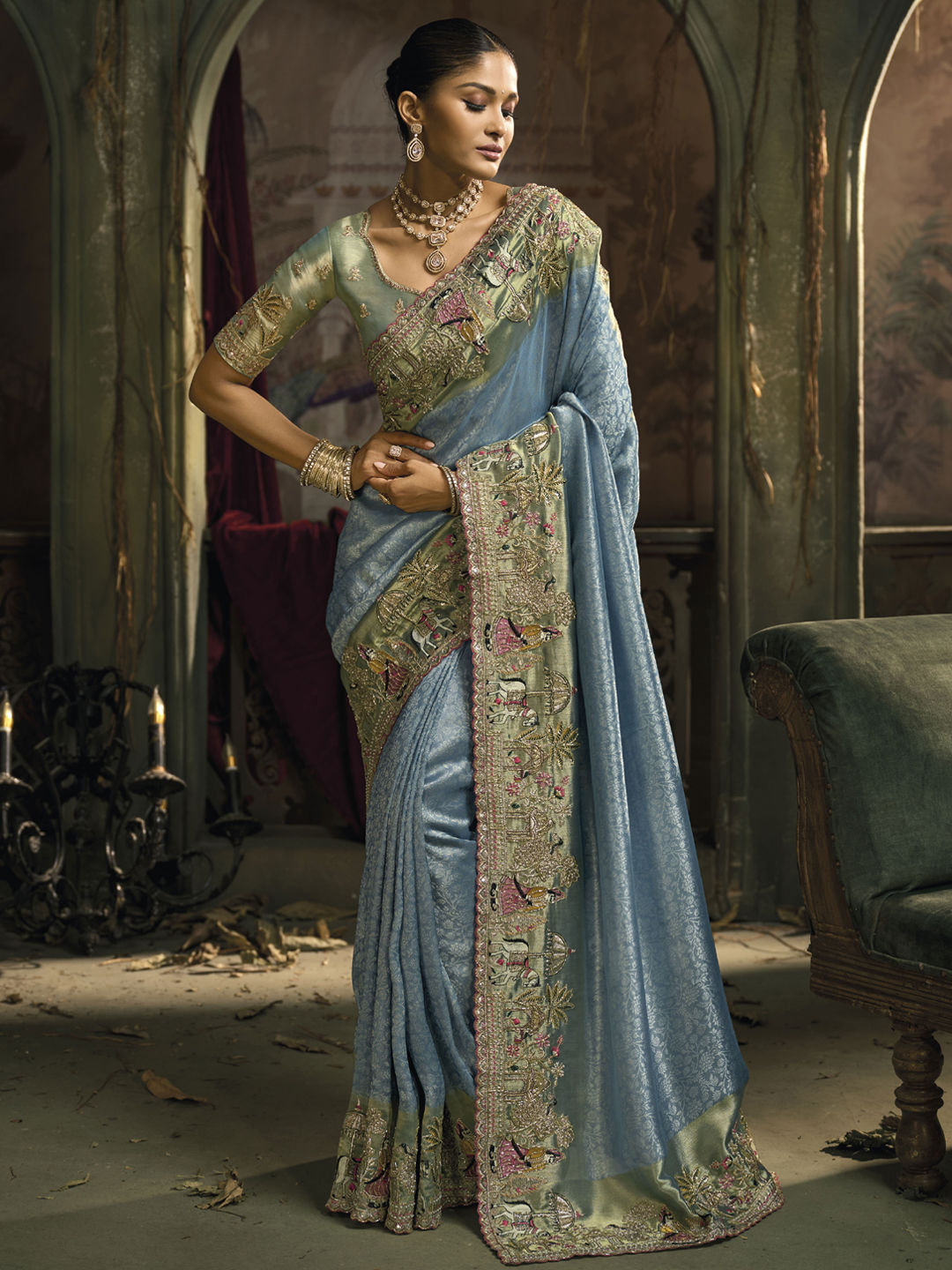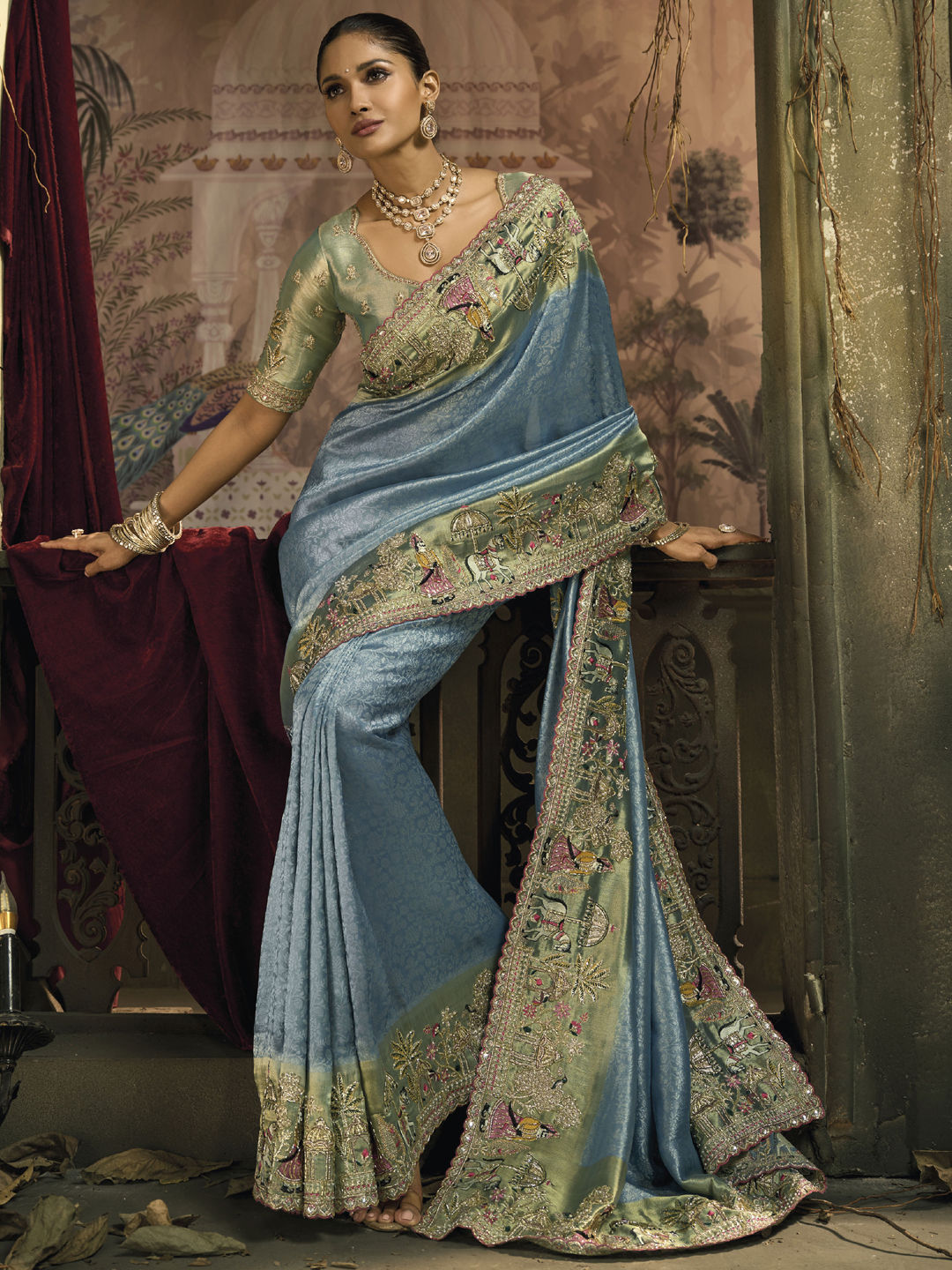 Description: Blue, Green color Saree in Silk fabric with Border, Cut Dana, Embroidered, Mirror, Moti, Thread, Zari work