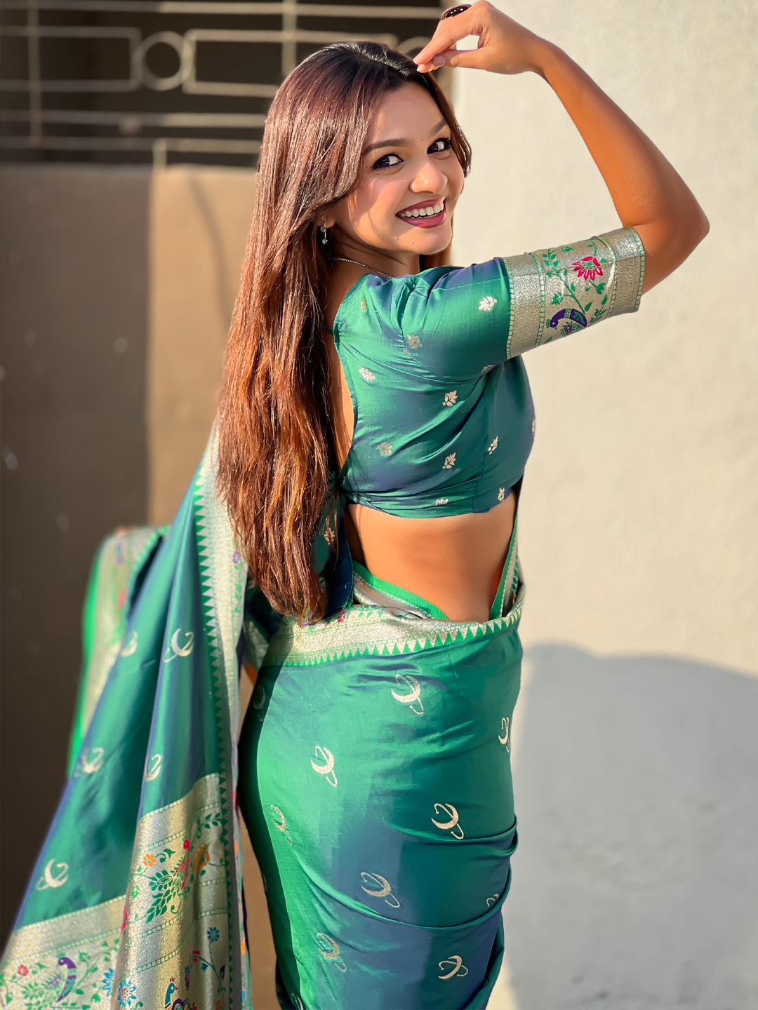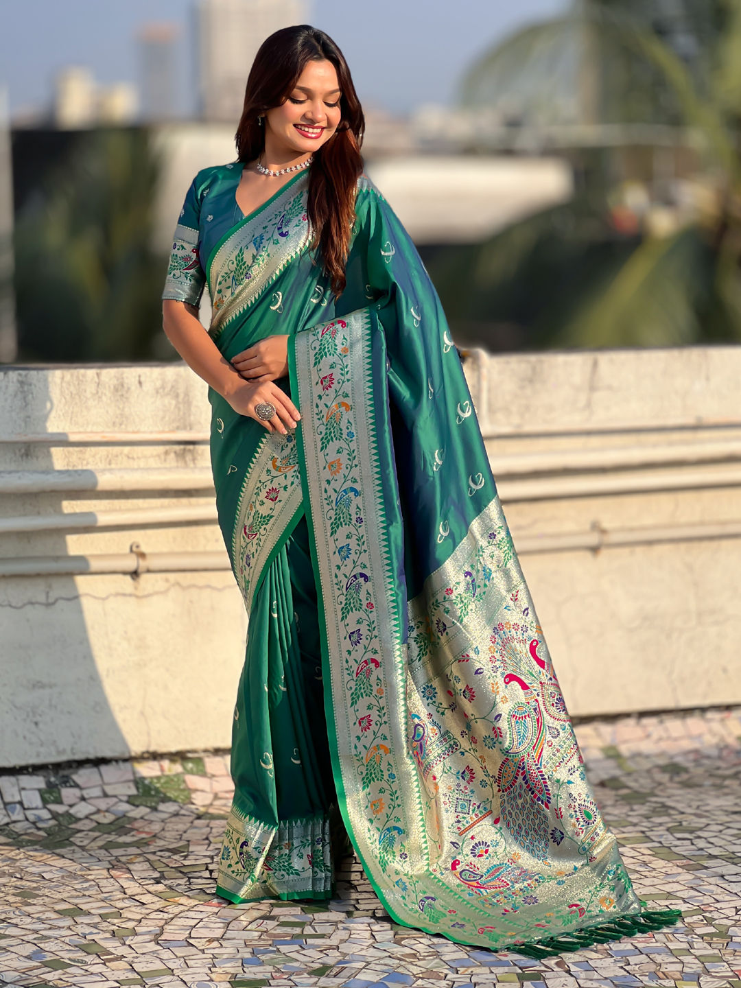 Silk Festive Saree in Green with Weaving work