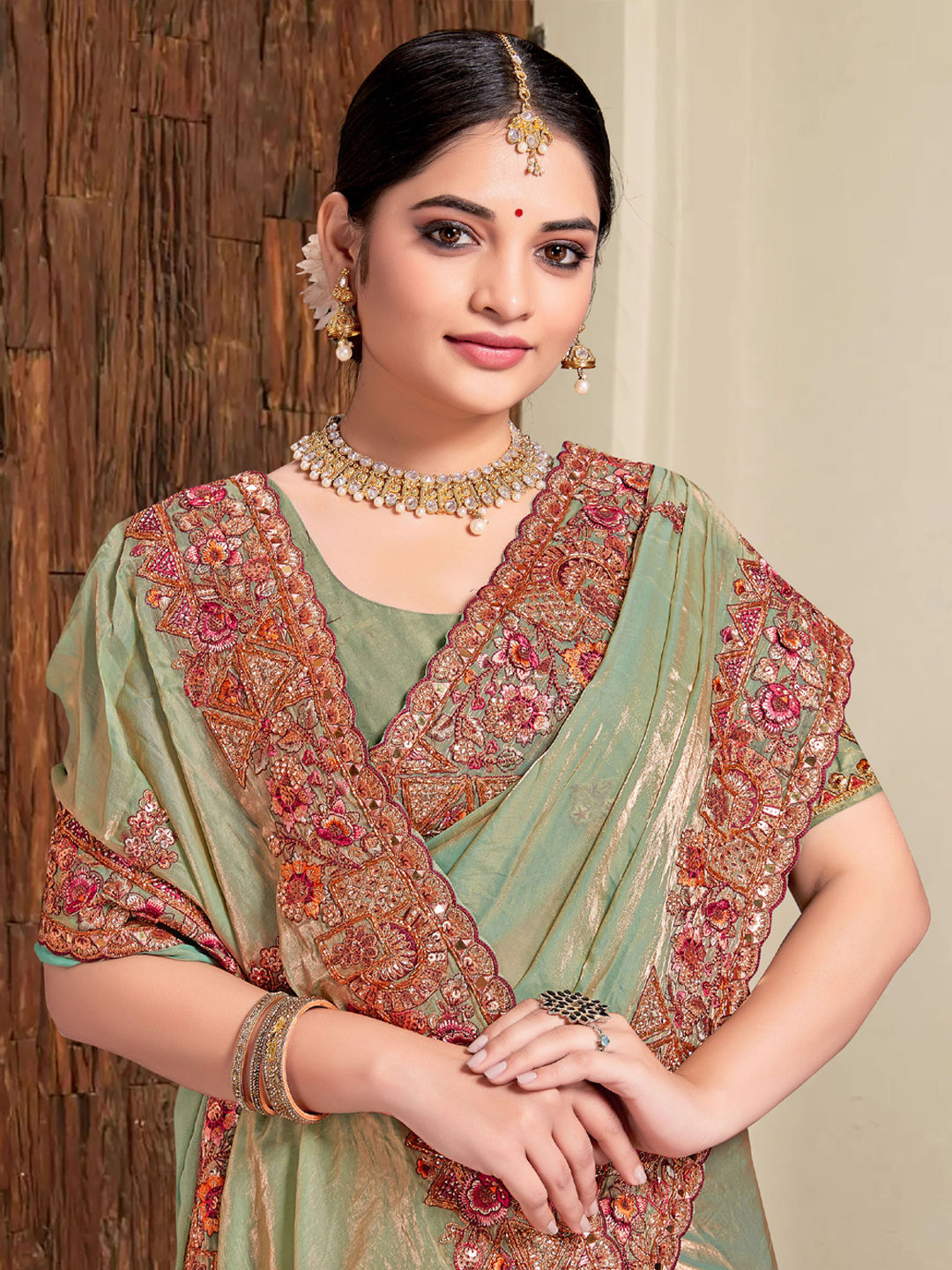 Green color Saree in Silk fabric with Bugle Beads, Embroidered, Resham, Thread, Zircon work