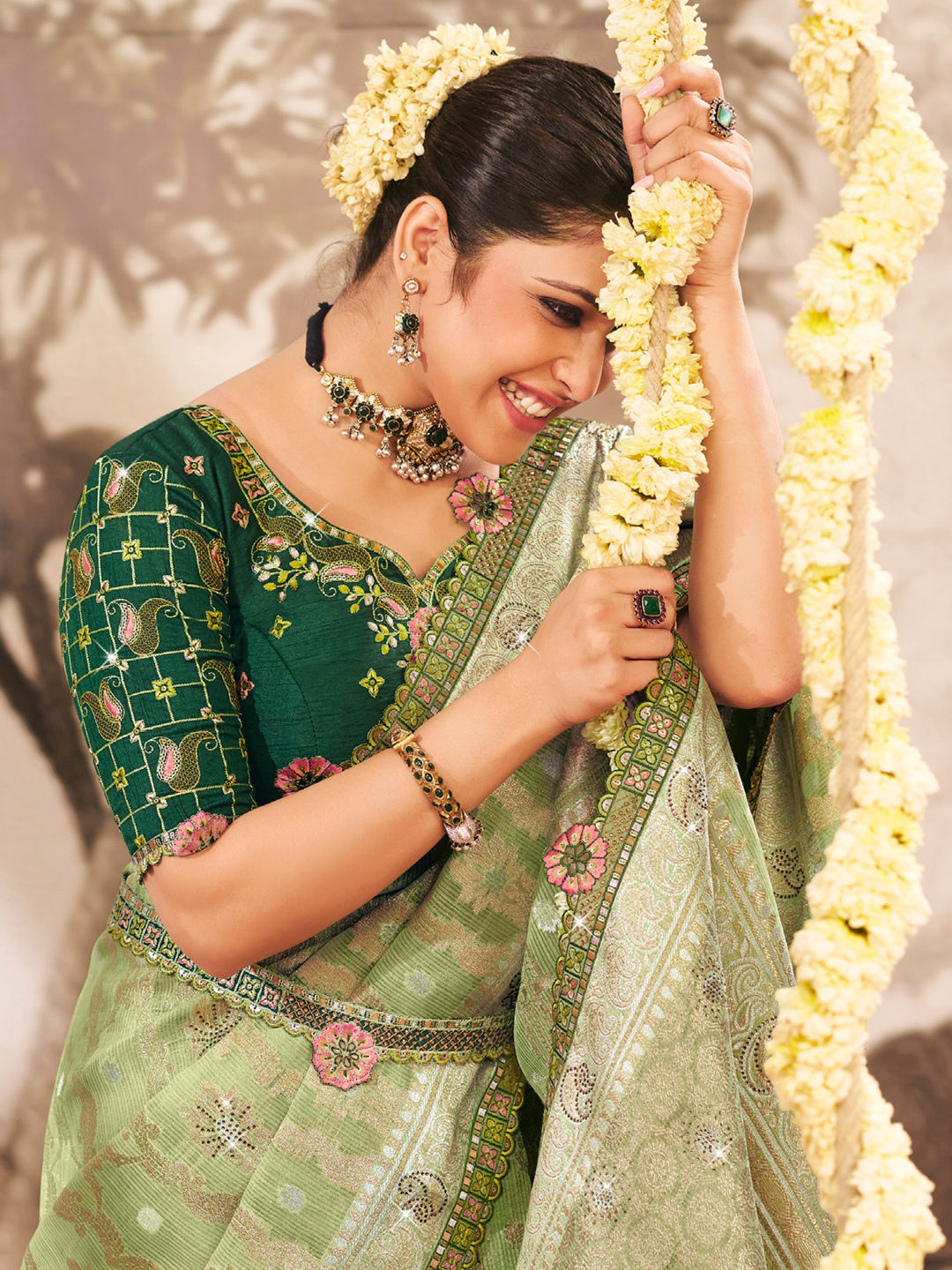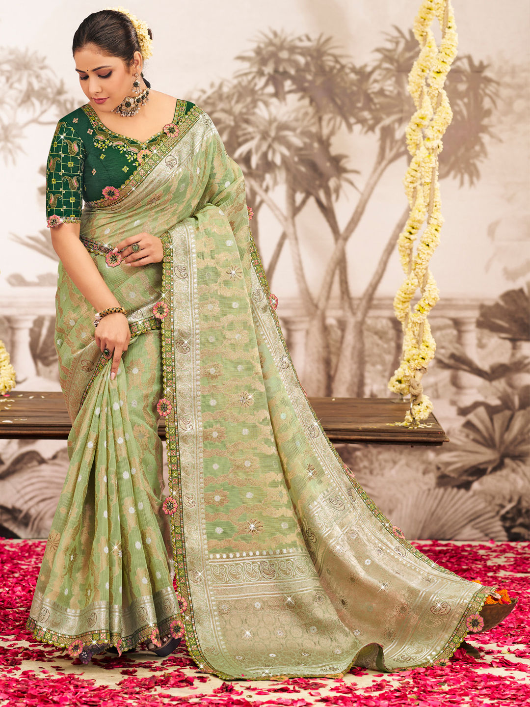 Green color Saree in Silk fabric with Lace, Weaving, Zircon work