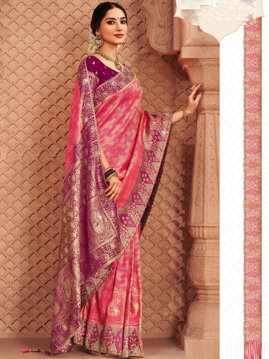 Pink and Majenta color Saree in Silk fabric with Border, Embroidered, Sequence, Weaving work