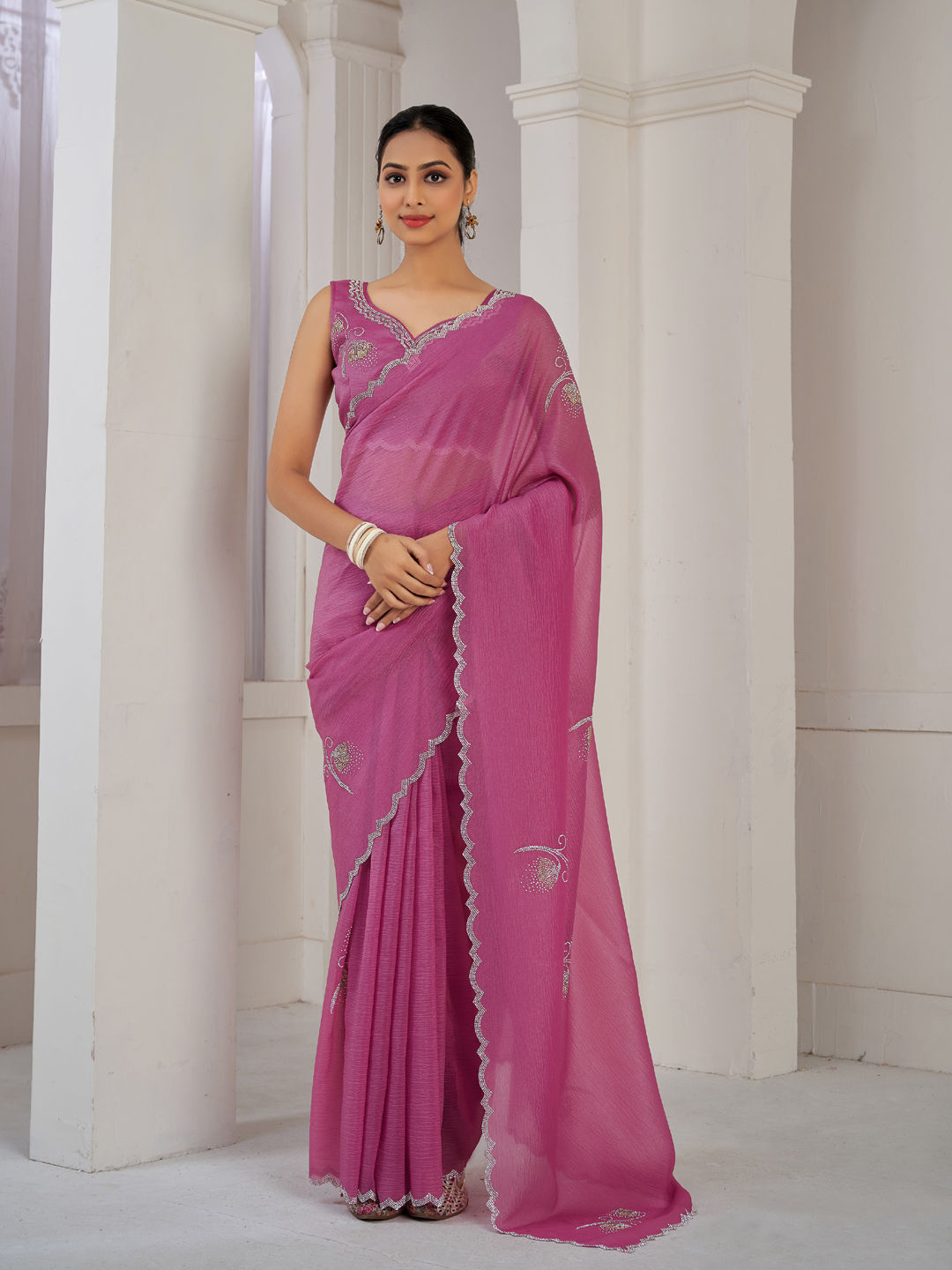 Pink and Majenta color Saree in Silk fabric with Stone, Zircon work