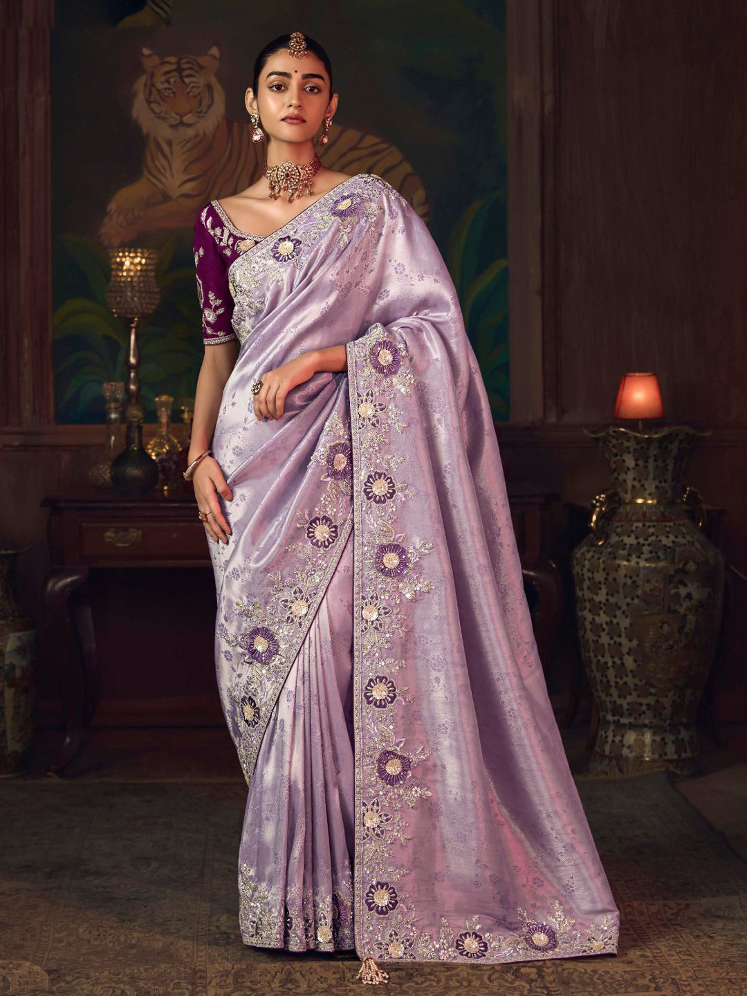 Purple and Violet color Saree in Silk fabric with Embroidered, Moti, Sequence, Thread work
