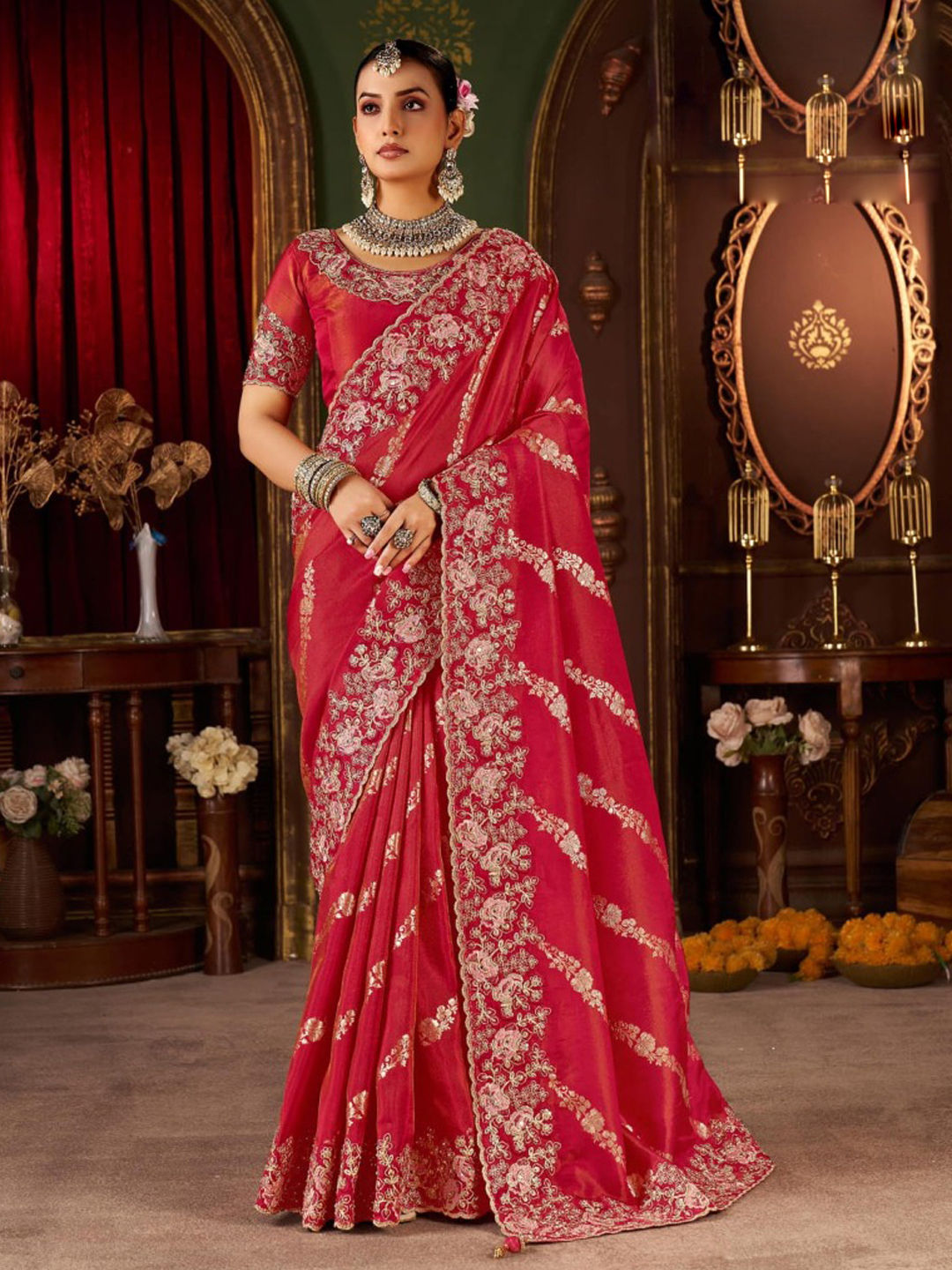 Red and Maroon color Saree in Silk fabric with Embroidered, Sequence, Thread work