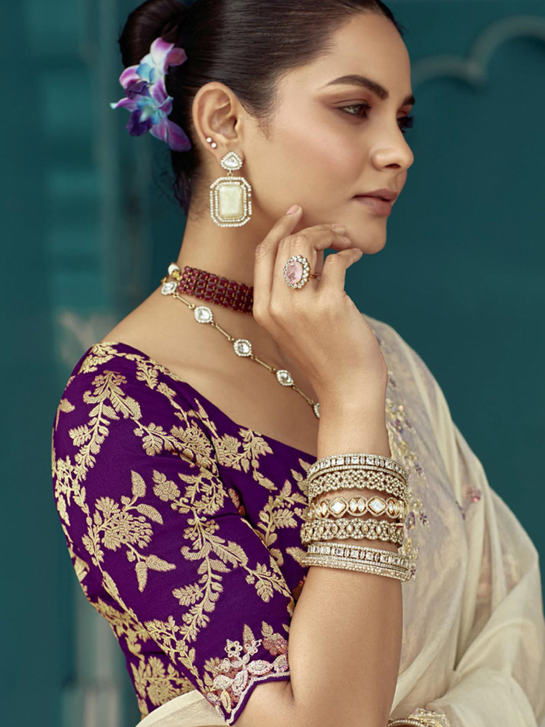 White and Off White color Saree in Silk fabric with Embroidered, Resham, Sequence, Thread work