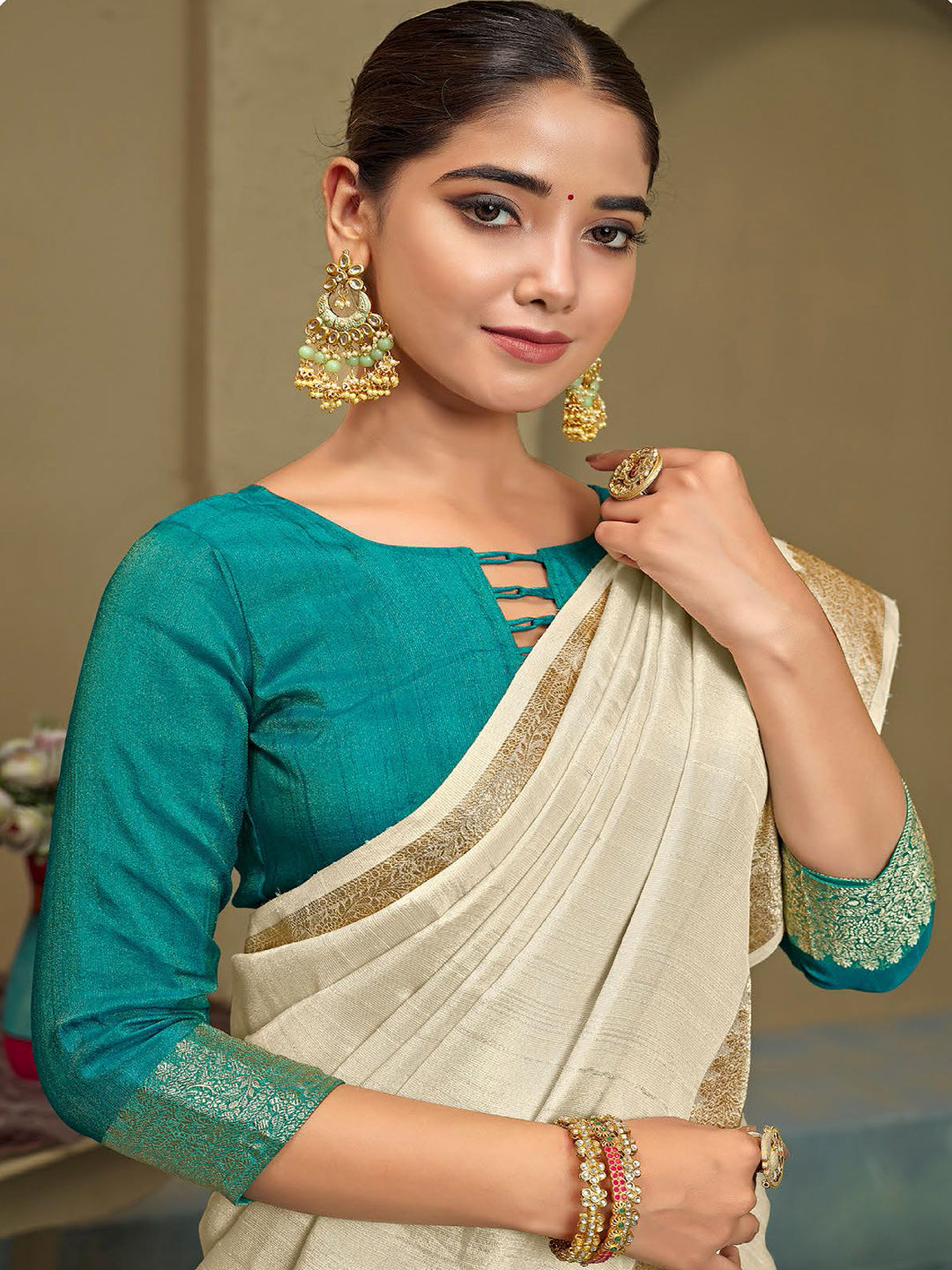 in White and Off White with Weaving work