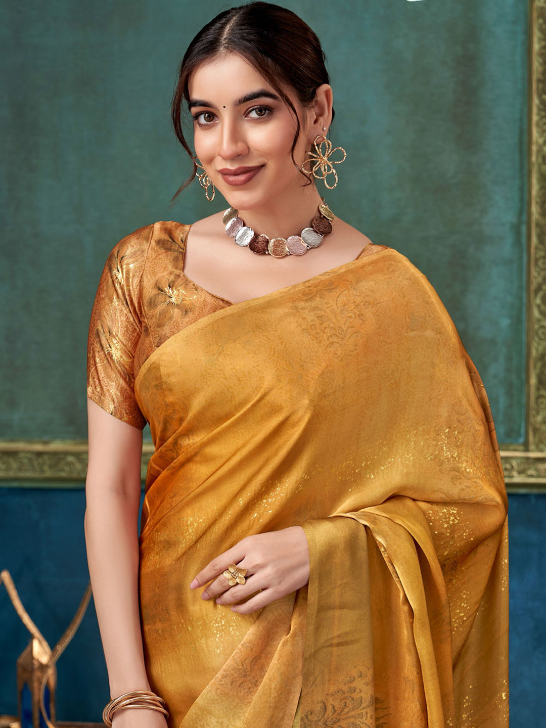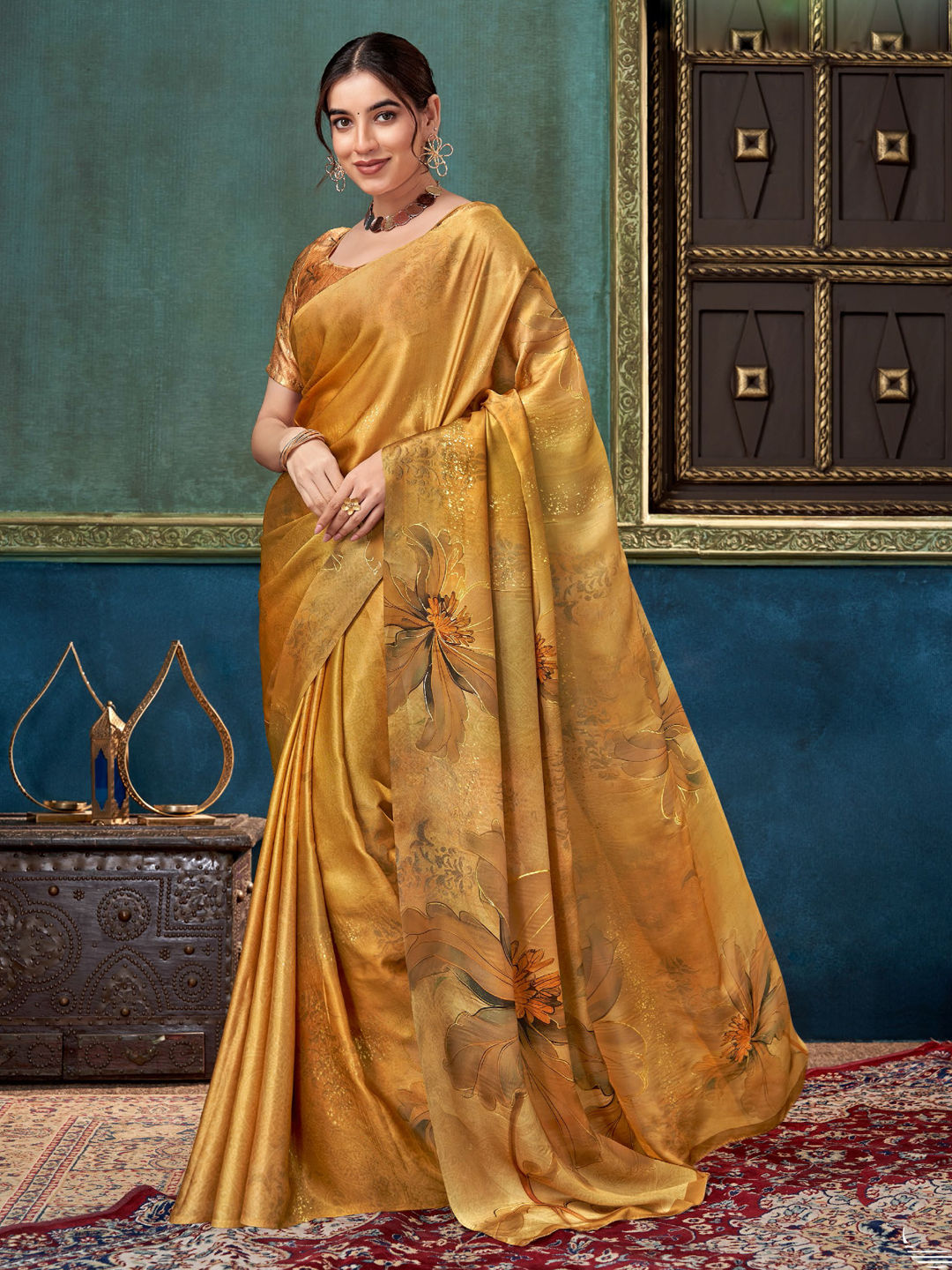 Yellow color Saree in Silk fabric with Floral, Printed work