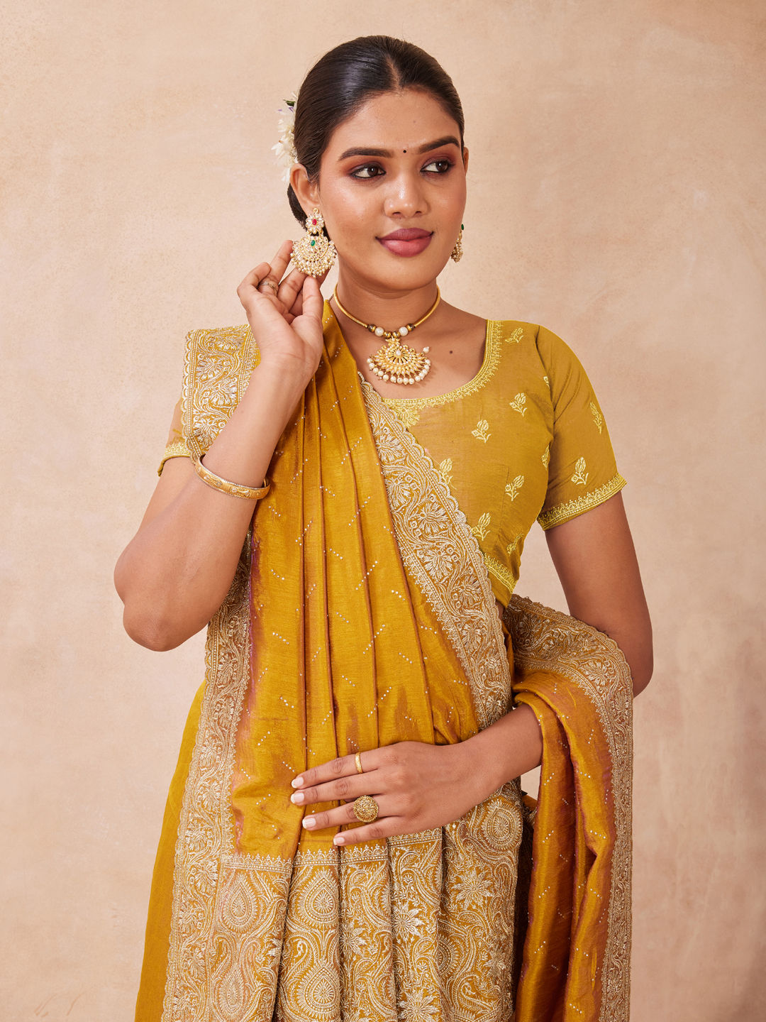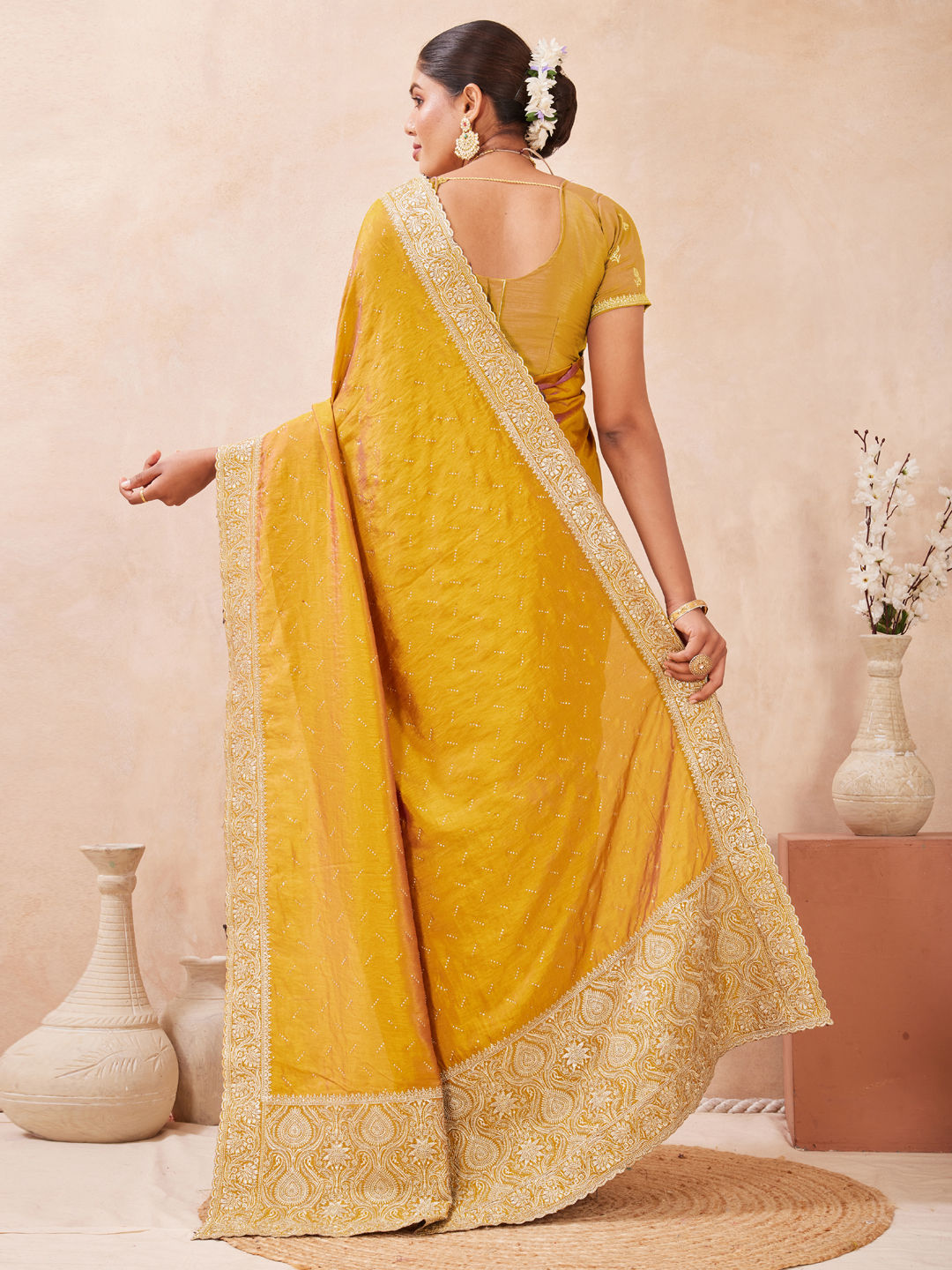 Yellow color Saree in Silk fabric with Embroidered, Swarovski, Zari work