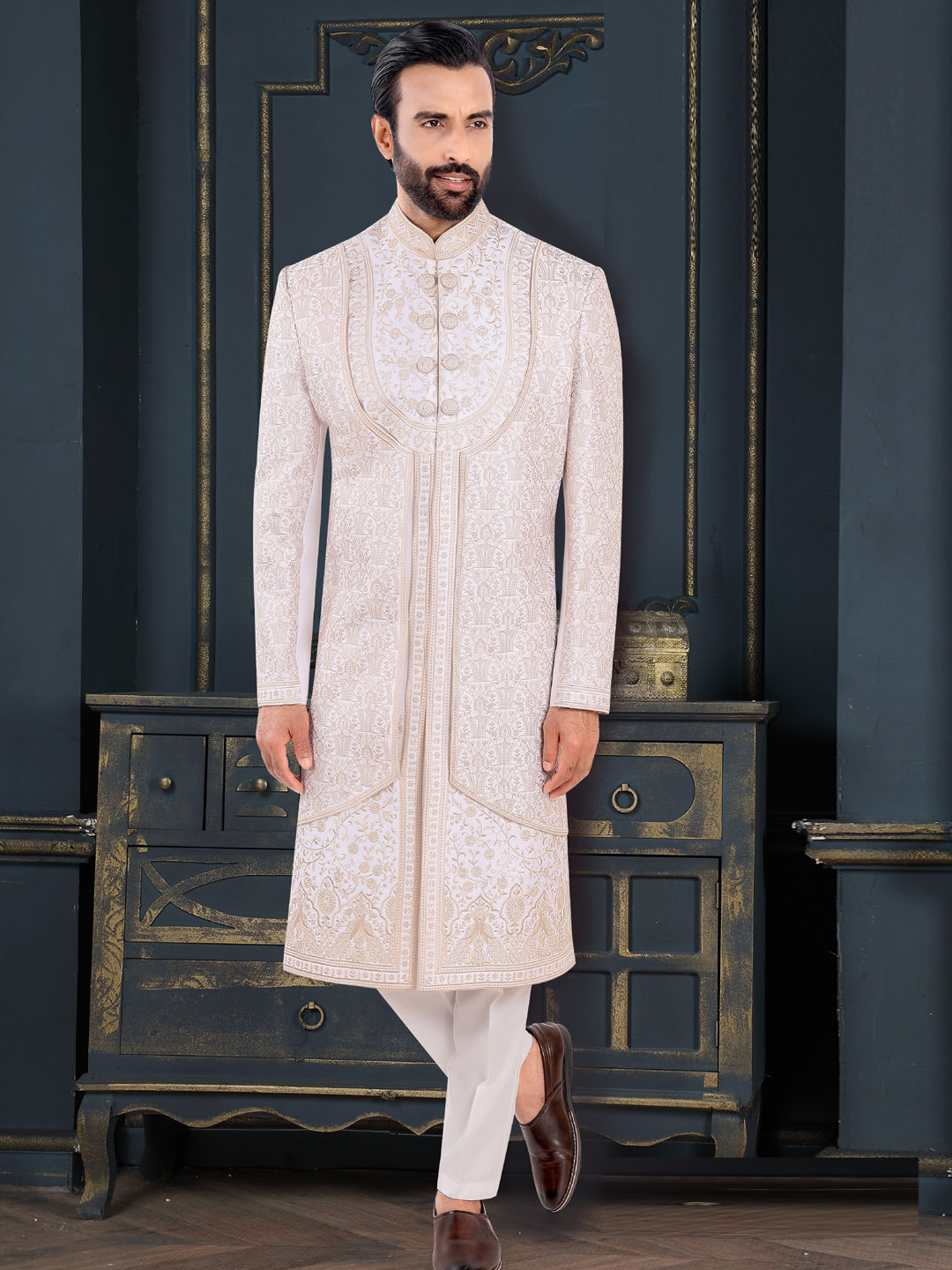 Jacquard Wedding Sherwani in White and Off White with Thread work