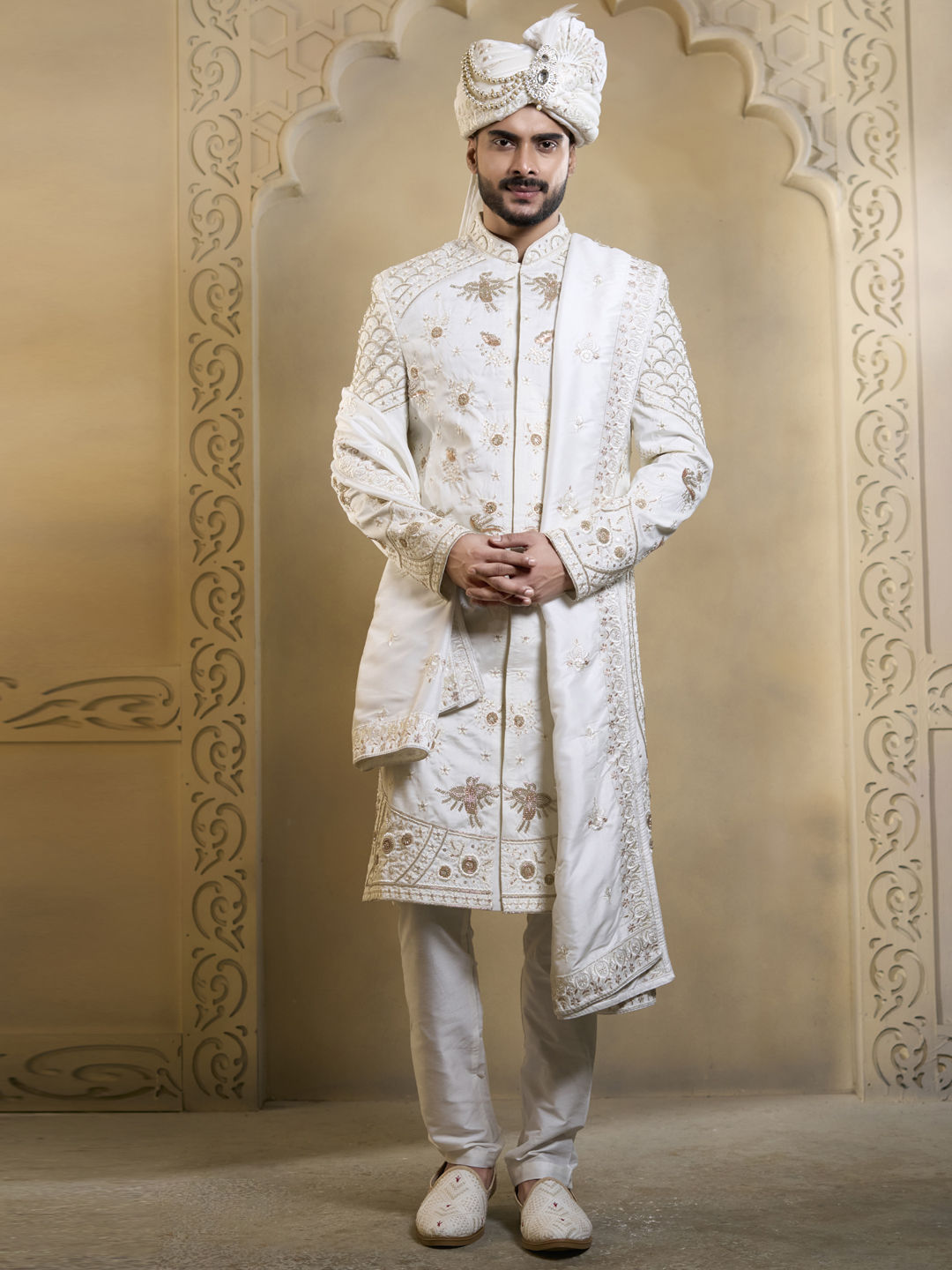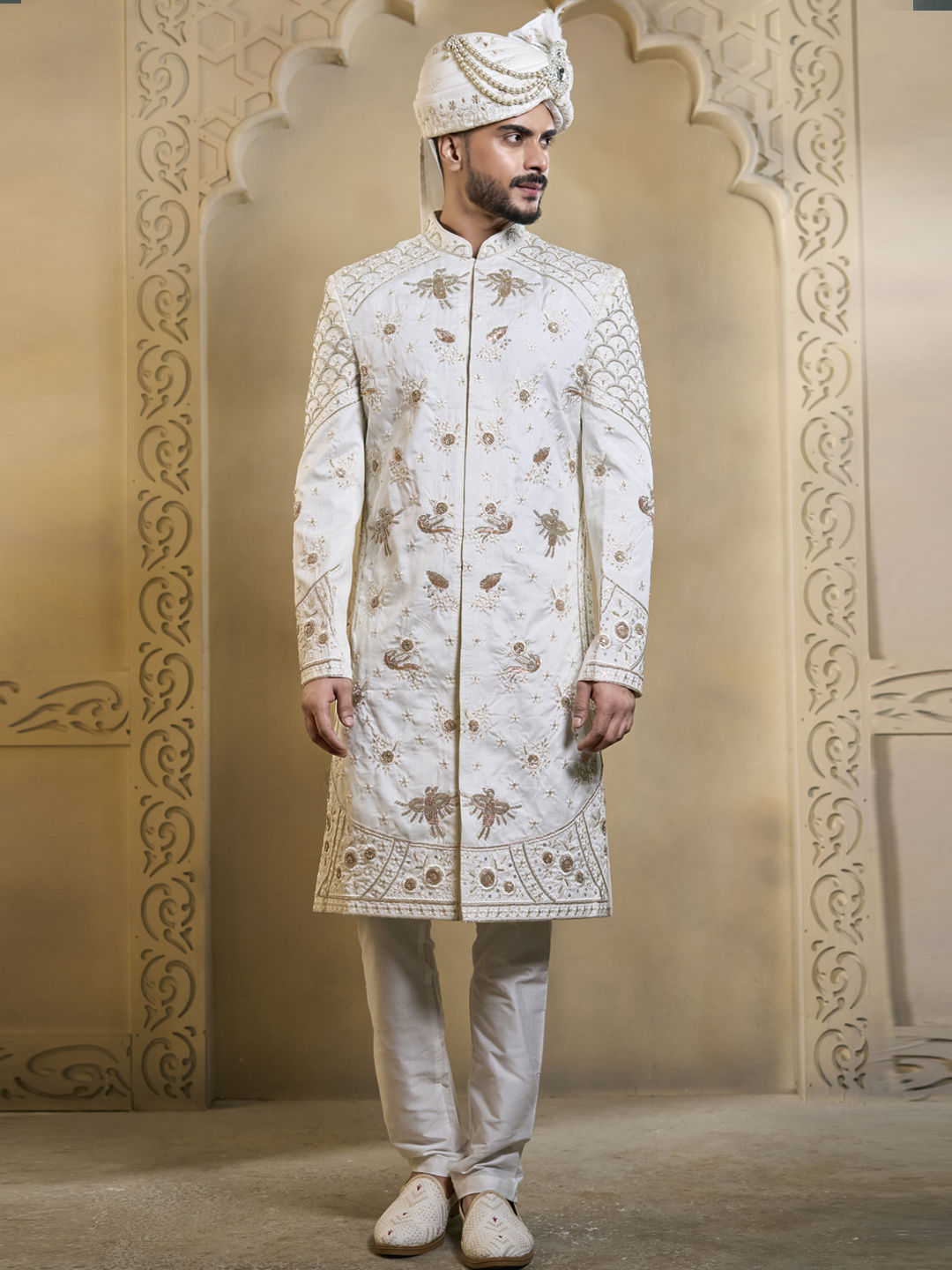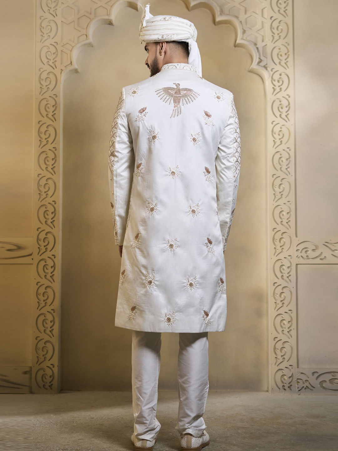 White and Off White color Sherwani in Silk fabric with Embroidered, Sequence work