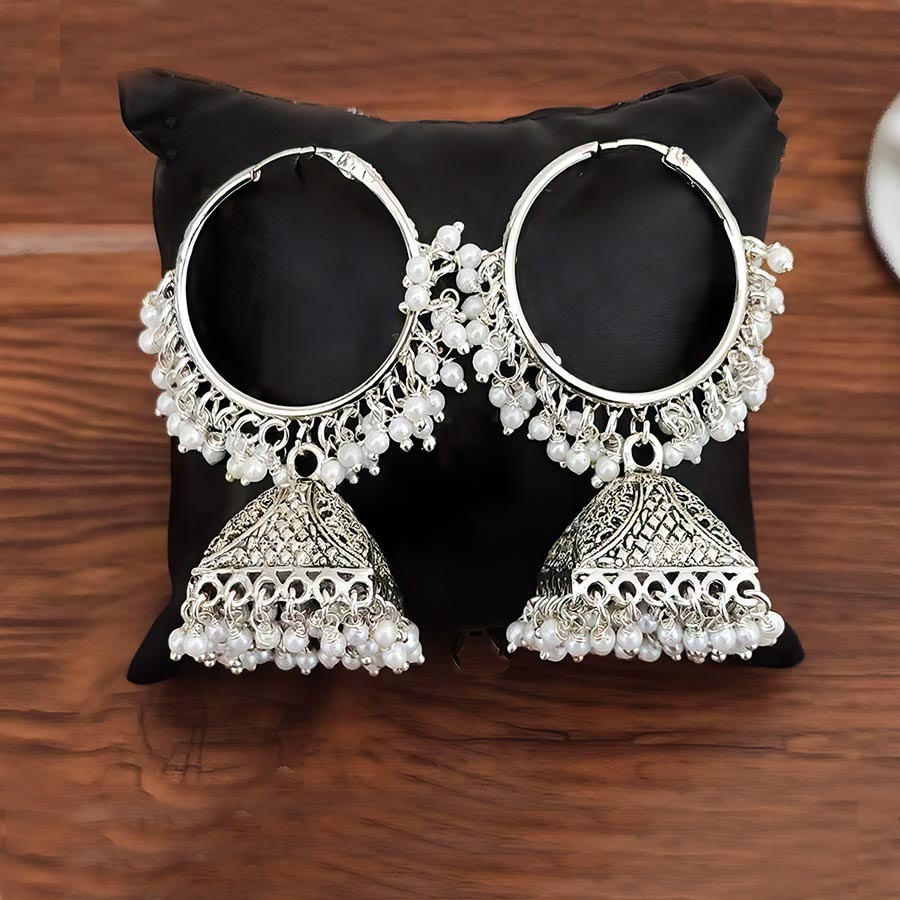 Silver Rodium Polish White and Off White color Earrings in Metal Alloy studded with Pearl