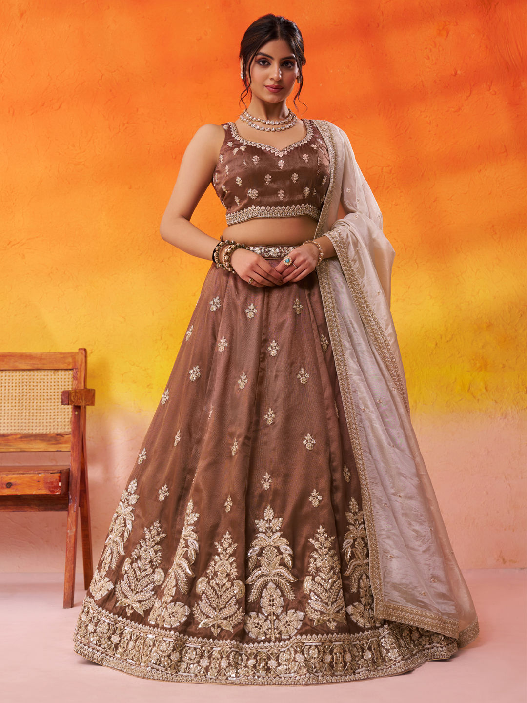 Beige and Brown color Lehenga in Tissue fabric with Embroidered, Moti, Sequence, Thread work