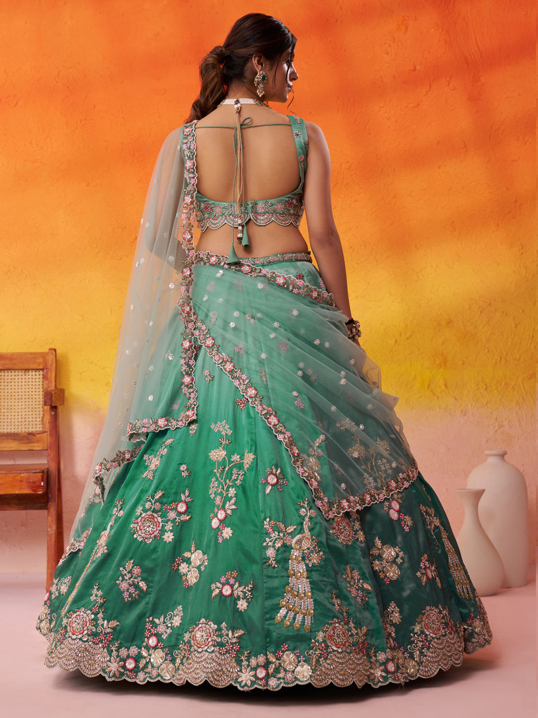 Green color Lehenga in Tissue fabric with Embroidered, Moti, Sequence, Thread work