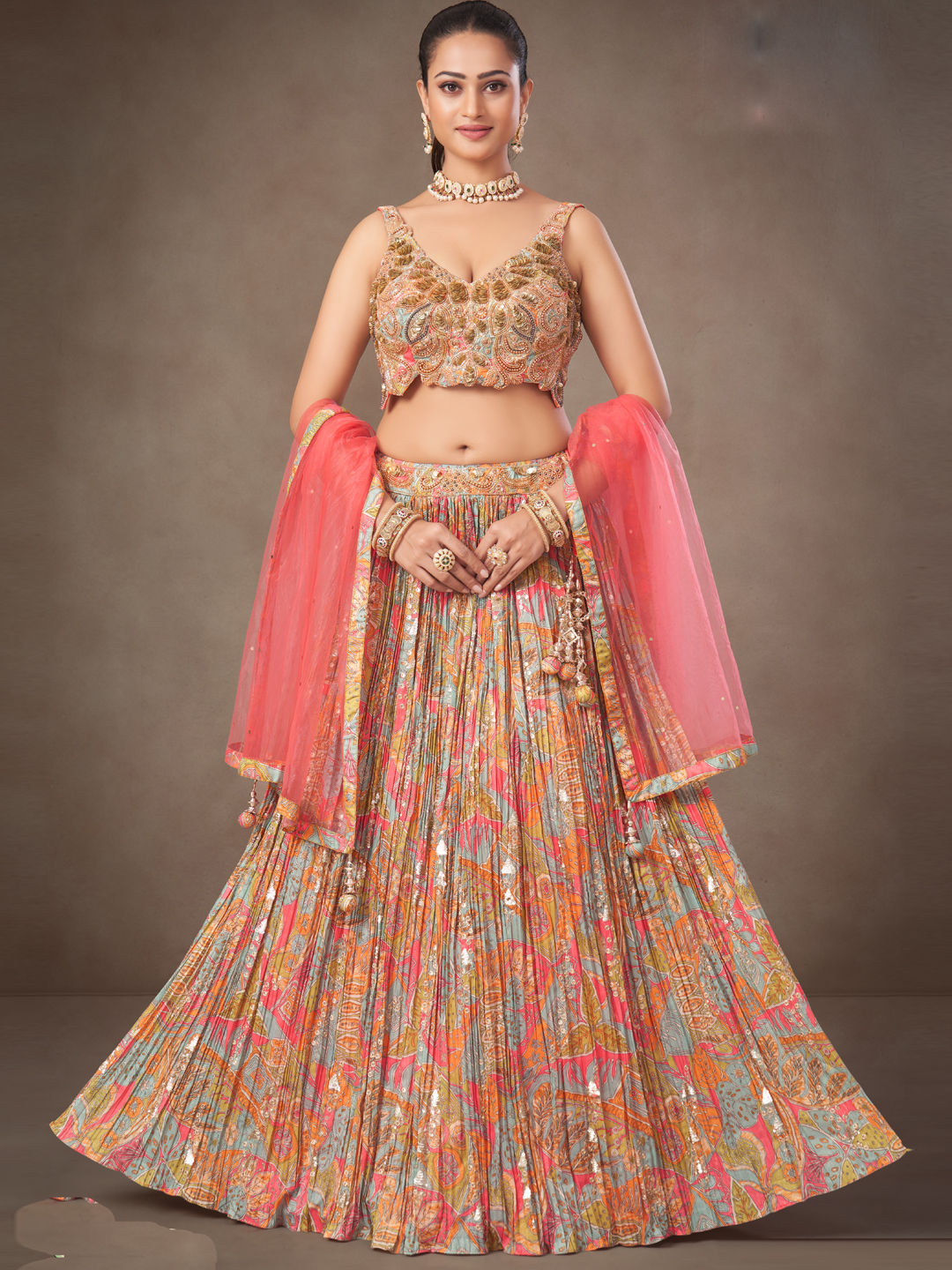 Tissue Engagement Lehenga in Multicolor with Printed work