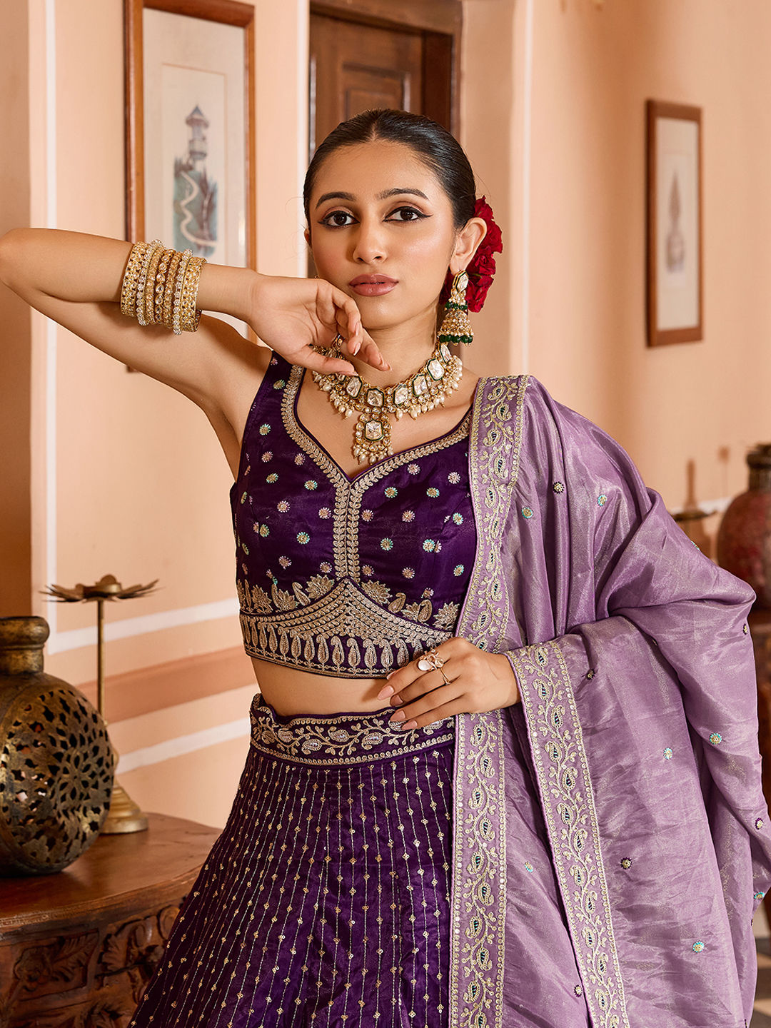 Purple and Violet color Lehenga in Tissue fabric with Embroidered, Sequence work