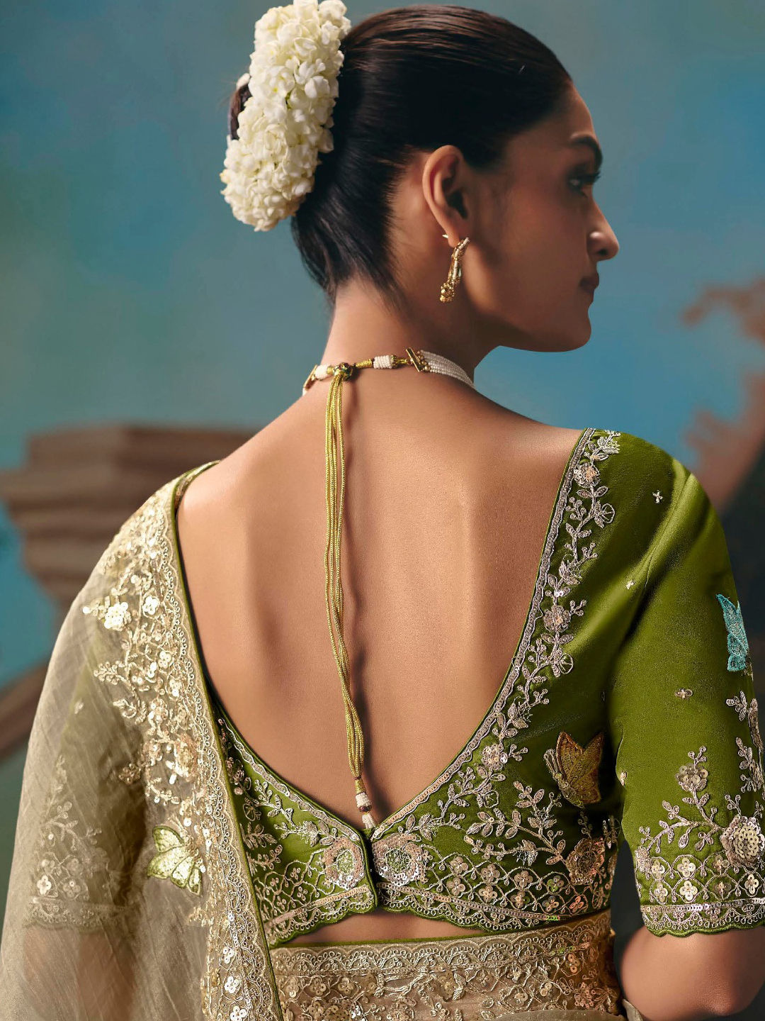 Beige and Brown color Saree in Tissue fabric with Border, Embroidered, Sequence work