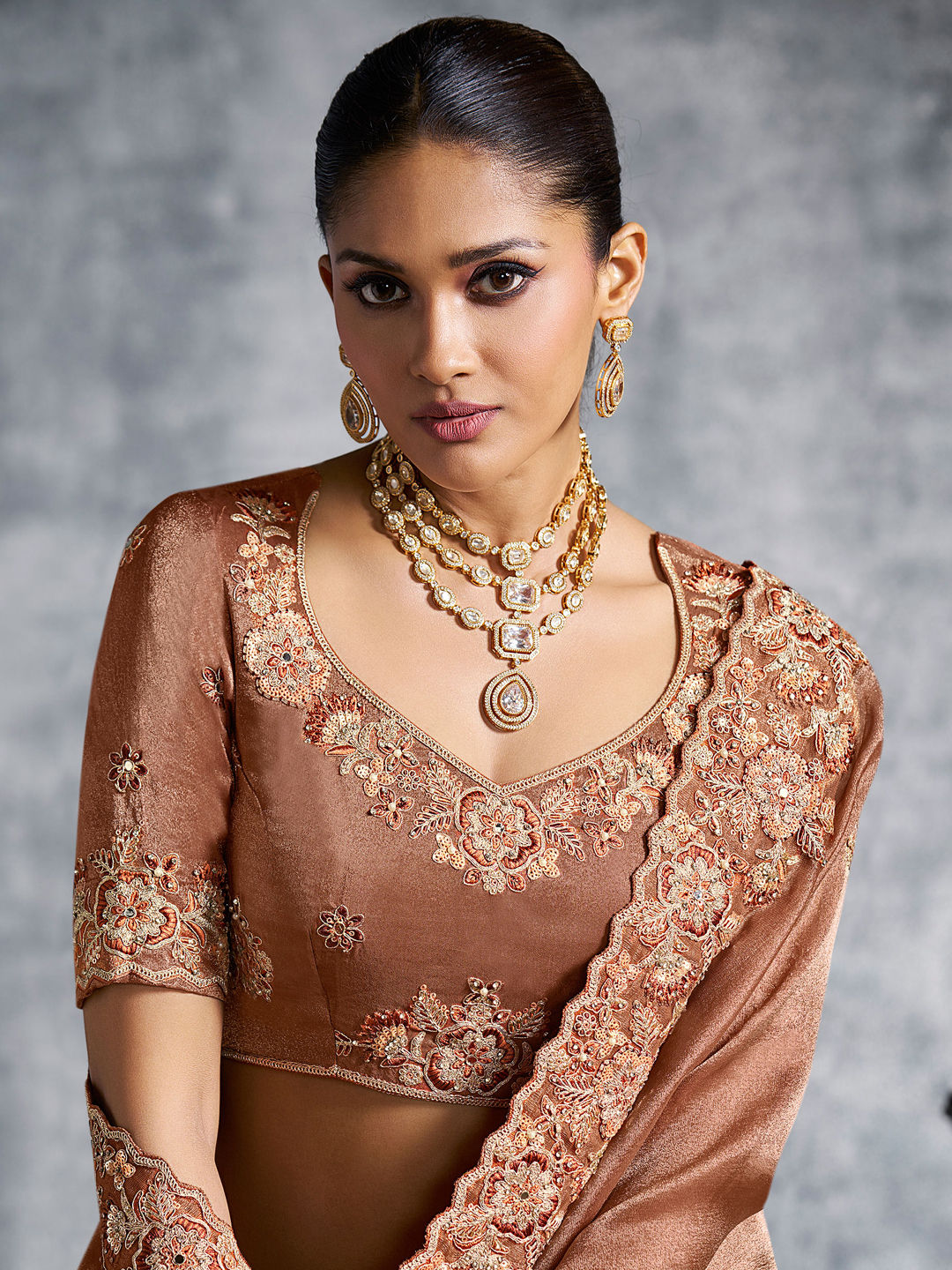 Beige and Brown color Saree in Tissue fabric with Border, Embroidered, Mirror, Resham, Sequence, Stone, Thread, Zari work