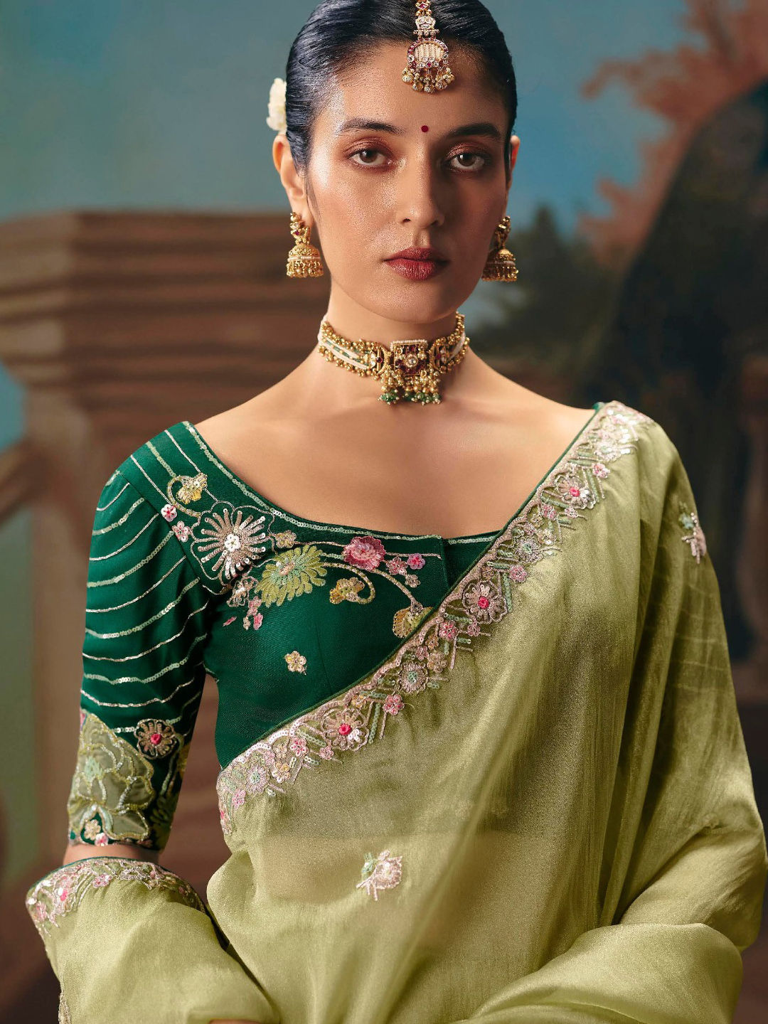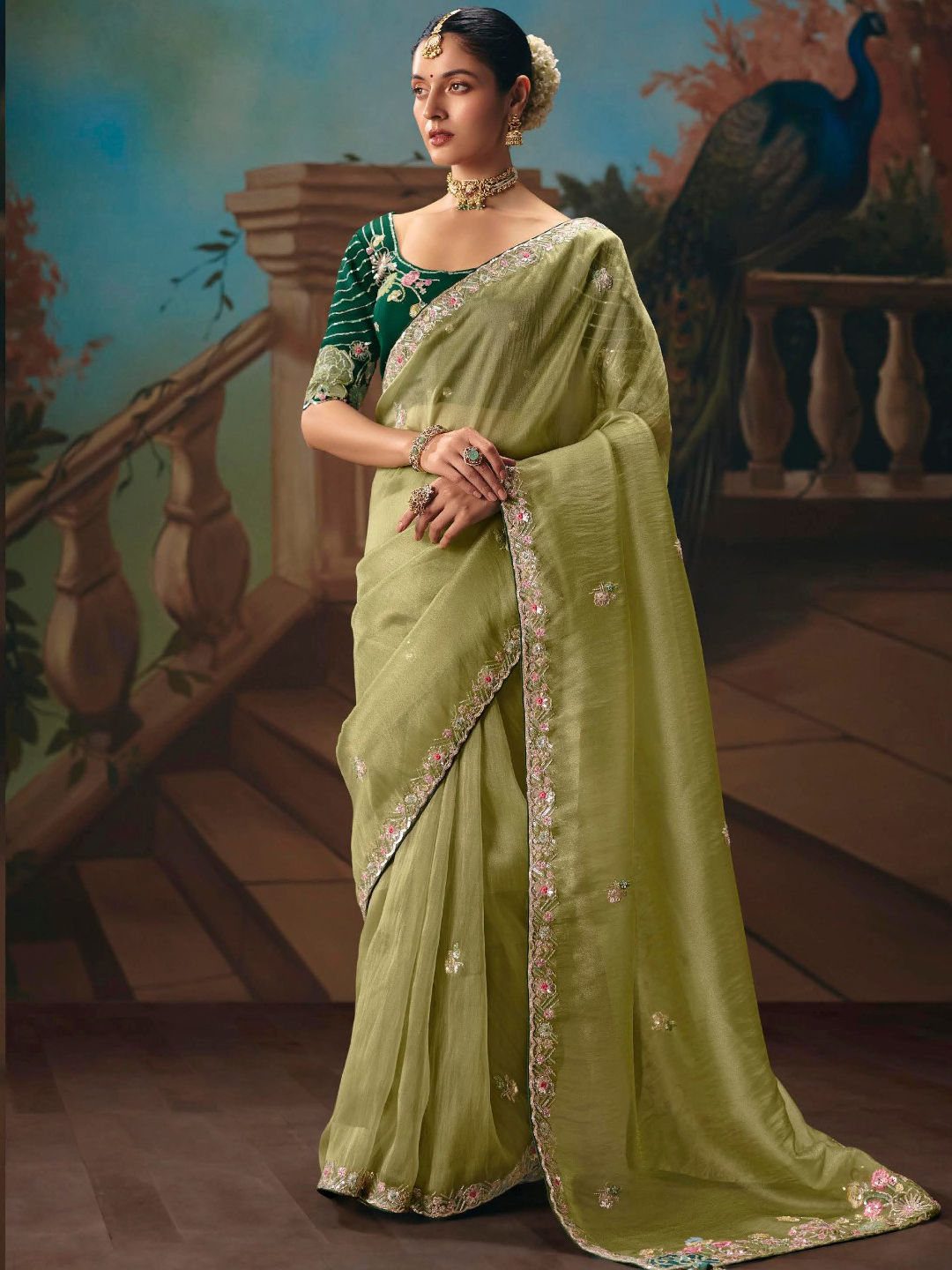 Green color Saree in Tissue fabric with Border, Embroidered, Sequence work