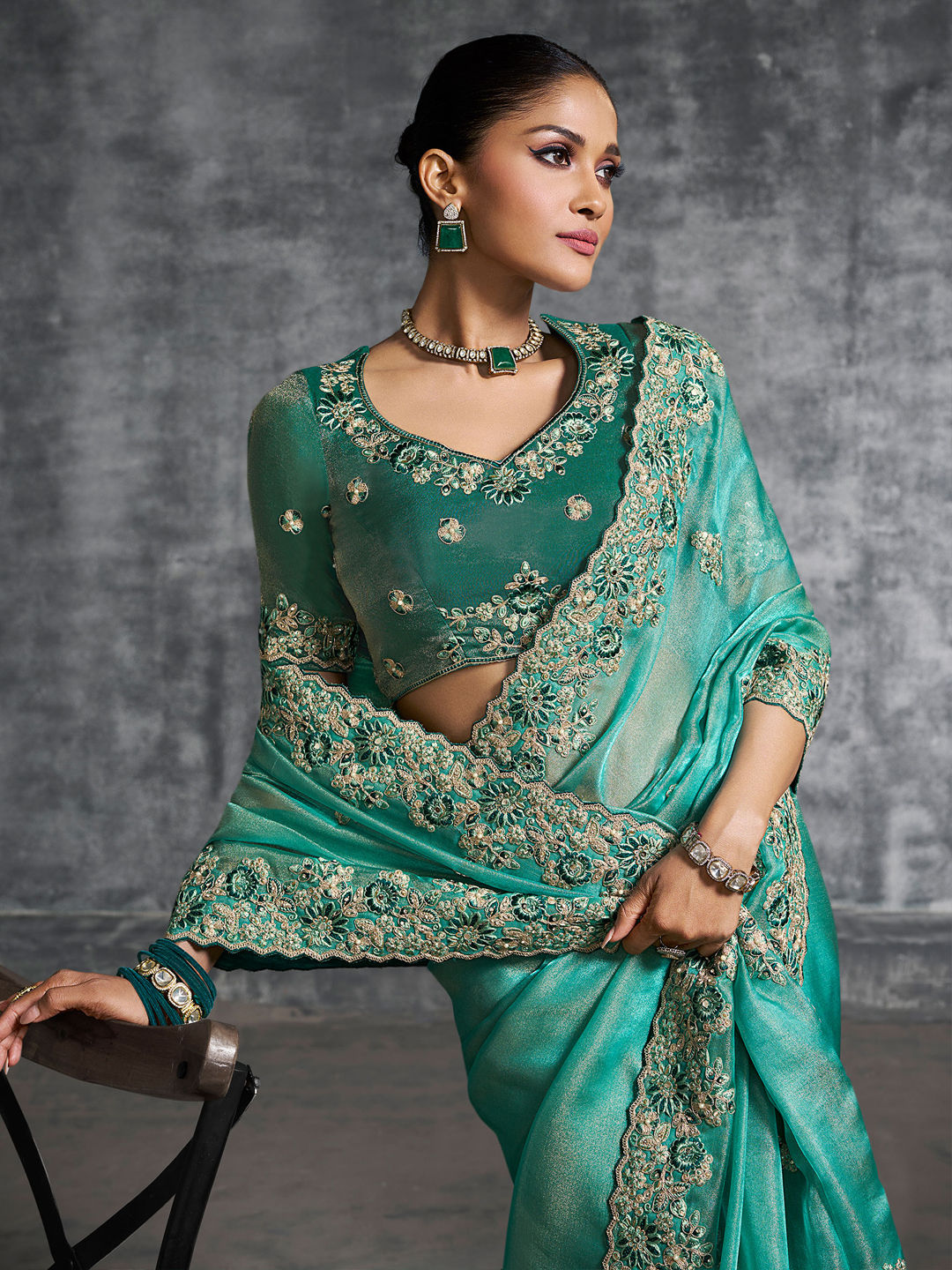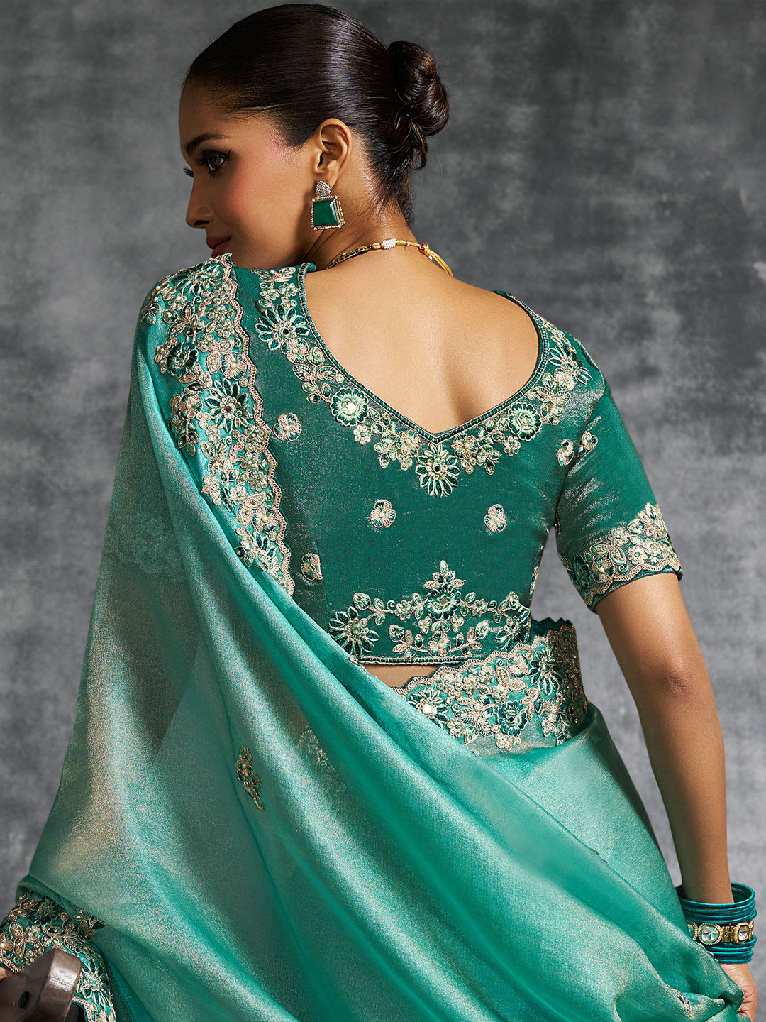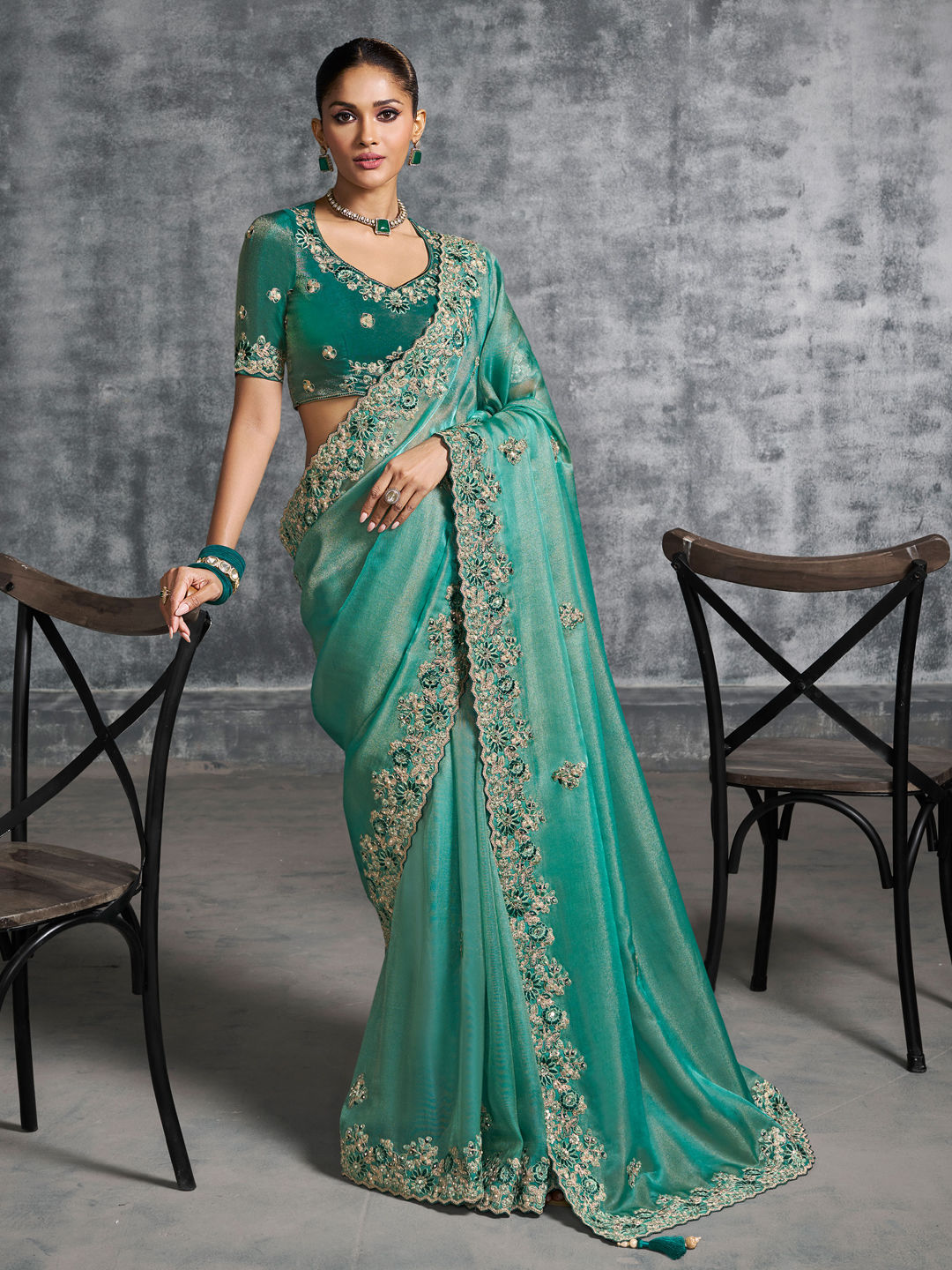 Description: Green color Saree in Tissue fabric with Border, Embroidered, Mirror, Resham, Stone, Thread, Zari work