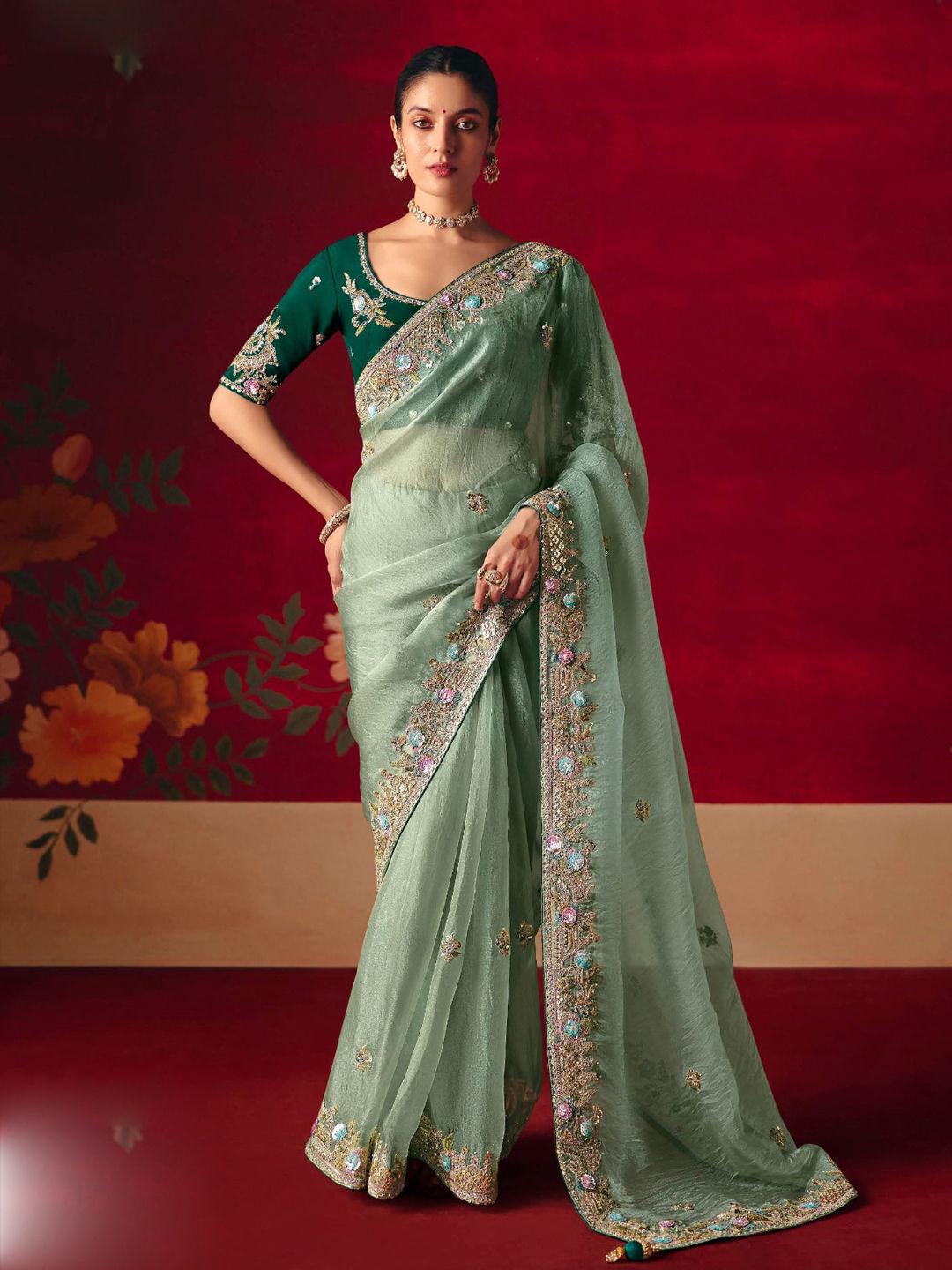 Tissue Bridal Saree in Green with Sequence work