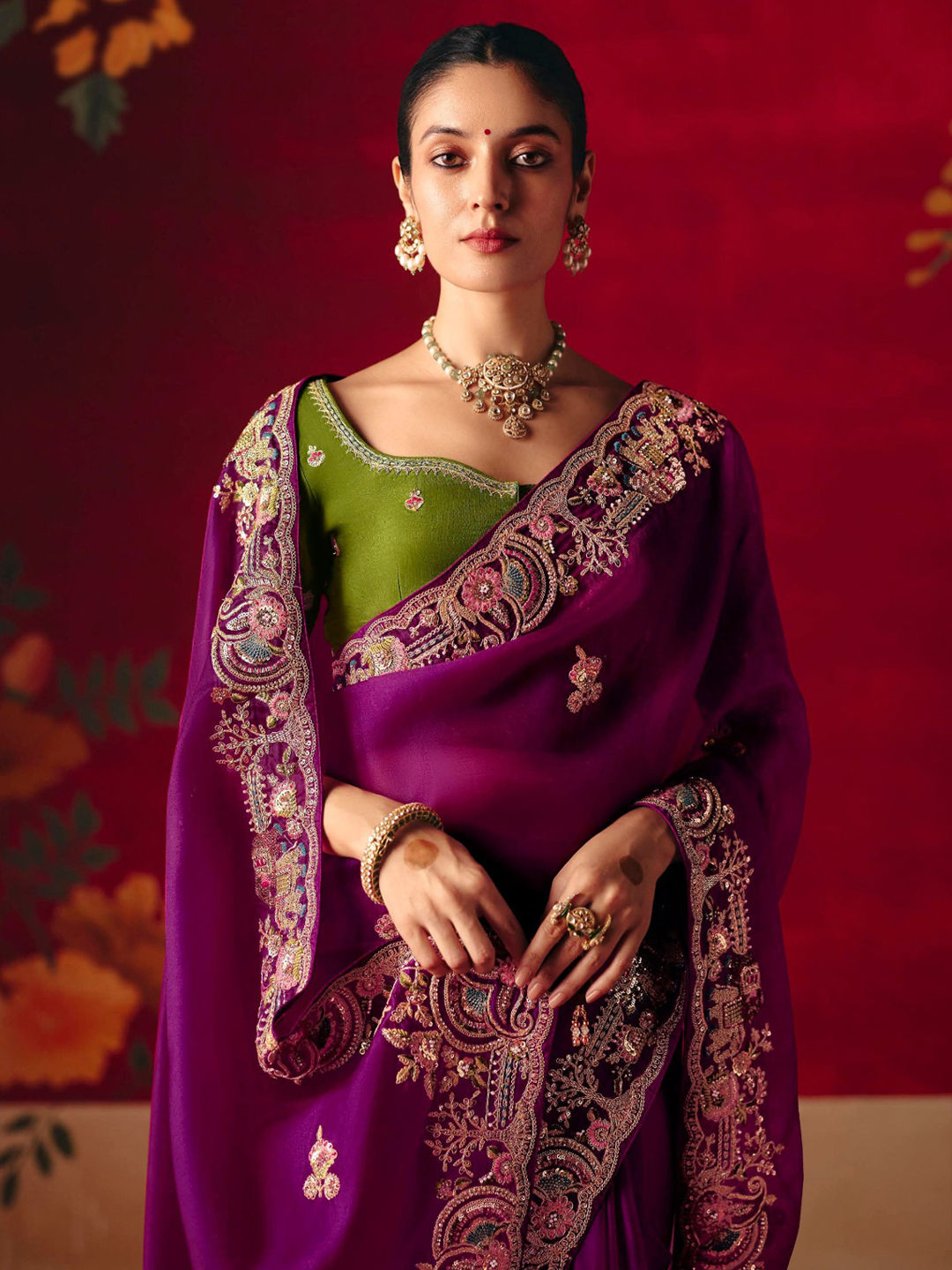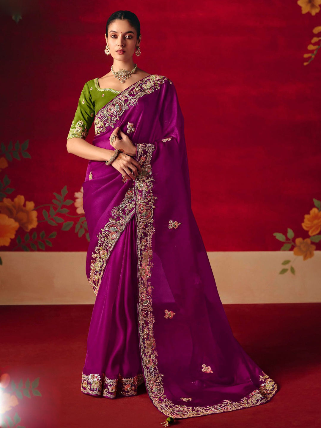 Pink and Majenta color Saree in Tissue fabric with Embroidered, Sequence, Stone, Thread, Zari work