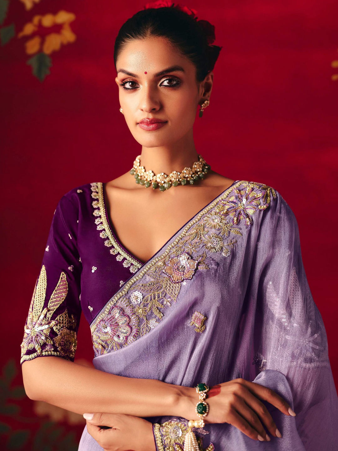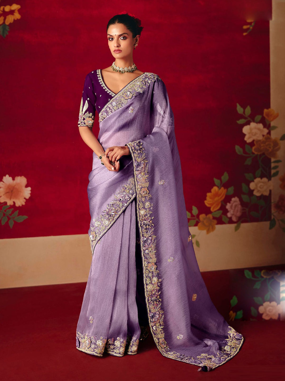 Purple and Violet color Saree in Tissue fabric with Embroidered, Sequence, Stone, Thread, Zari work